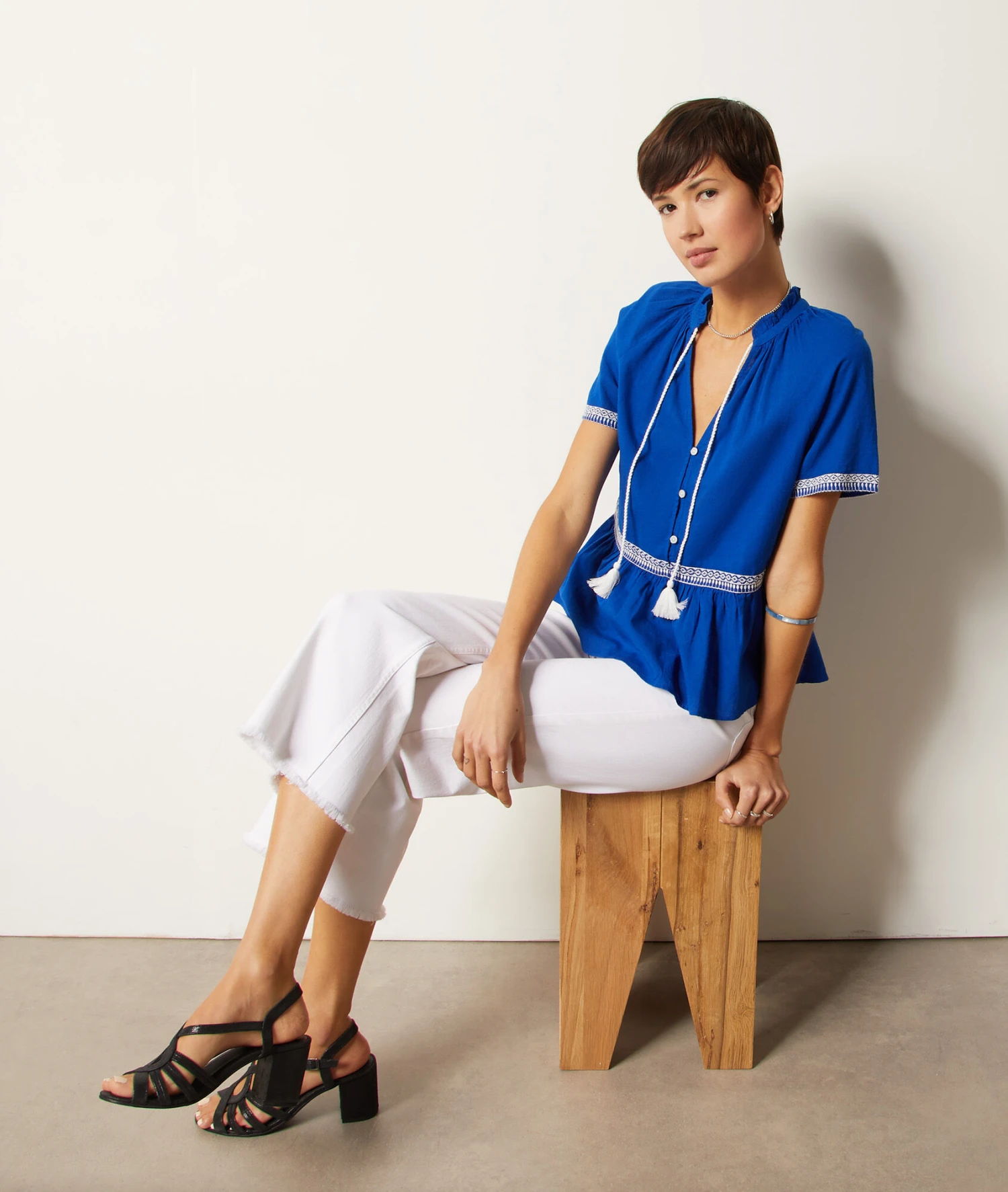 Cap sur les Cyclades ! Etam nous fait voyager cette saison à travers une collection aux inspirations méditerranéennes. Cette blouse bleu azur légèrement plissée, dévoile une coupe ample ultra confortable, un col volanté, des détails broderies contrastés sur les manches et à la taille et un lien muni de pompons pour un décolleté plus ou moins dégagé. Idéale à porter la belle saison avec un short en jean la journée ou un pantalon fluide le soir.