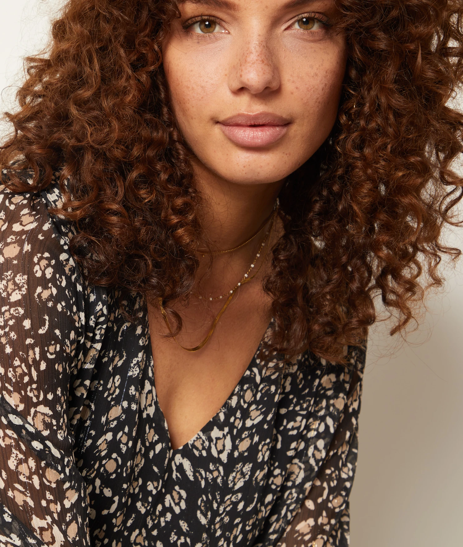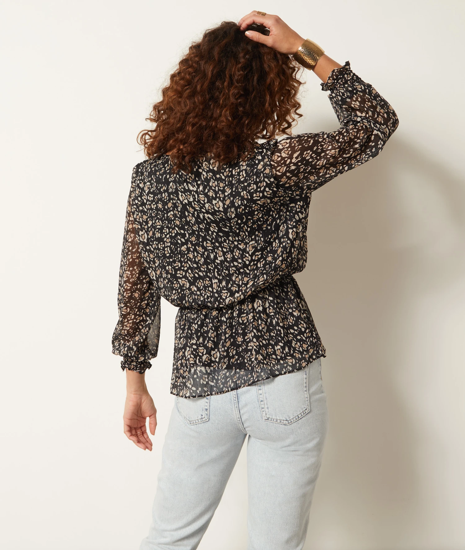 Munie d’un décolleté en V, de manches longues et d’une taille smockée, cette blouse légère et transparente dévoile un imprimé léopard.
