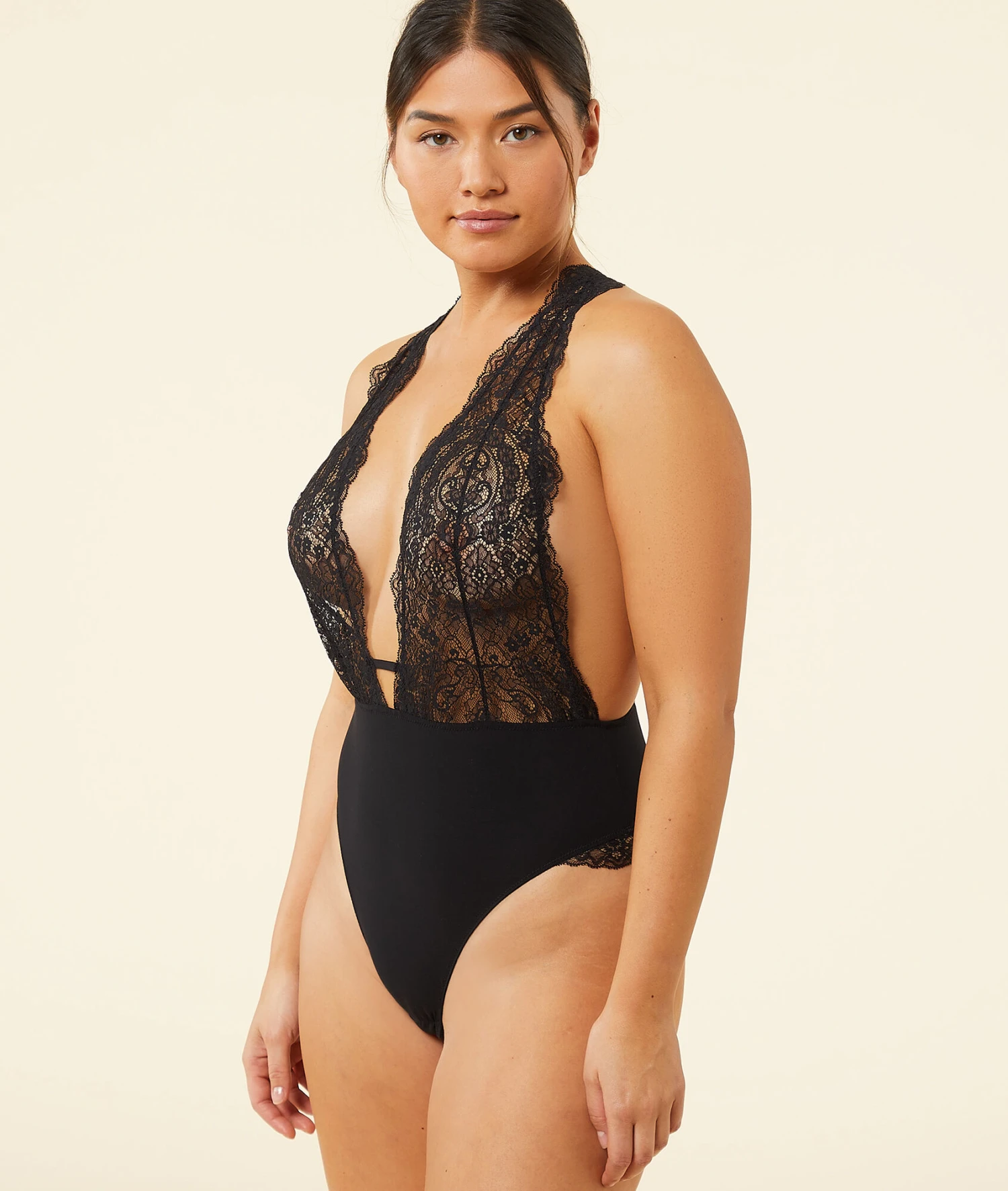 Ce body en dentelle ultra-sexy dévoile la peau en transparence pour un décolleté plongeant sublimé. Des détails de découpe et de bretelles croisées participent à mettre en valeur les courbes.