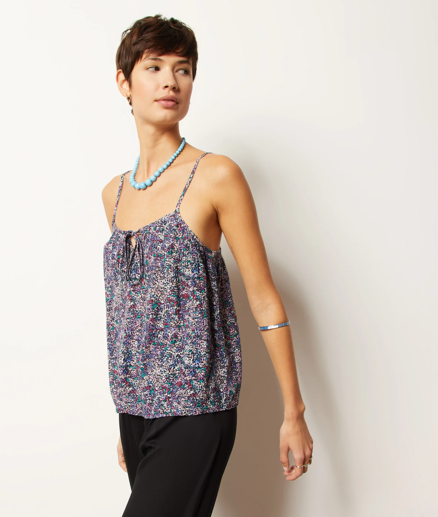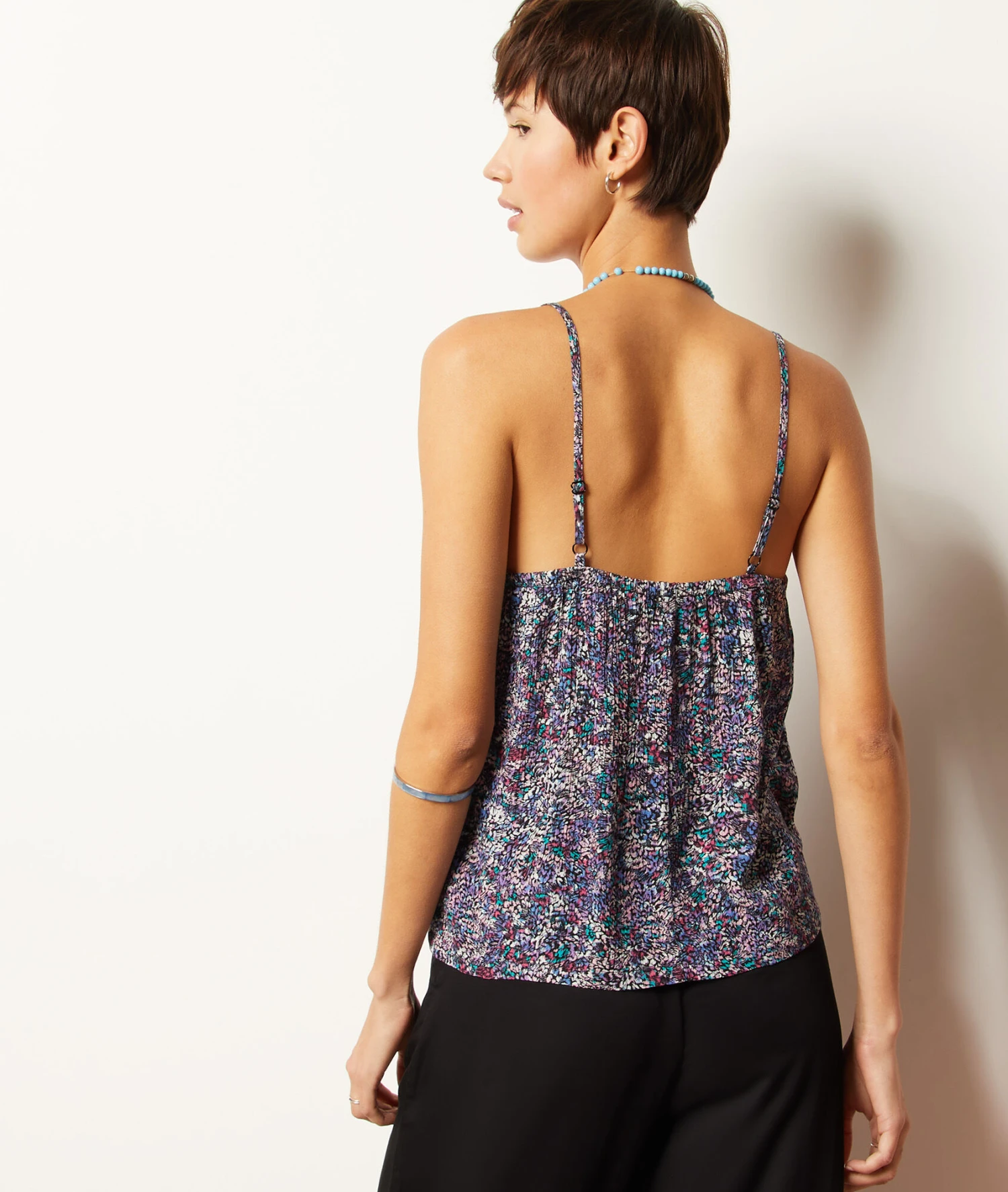 Fluide et léger, ce top fleuri est muni de bretelles fines et dévoile un décolleté droit à liens, ainsi qu’une légère ouverture dans le dos, comme une invitation à faire entrer le printemps dans son vestiaire. Associez-le à un jean à la coupe radicalement flare et des sandales à talons carrés pour un look d’été sexy et ultra féminin.