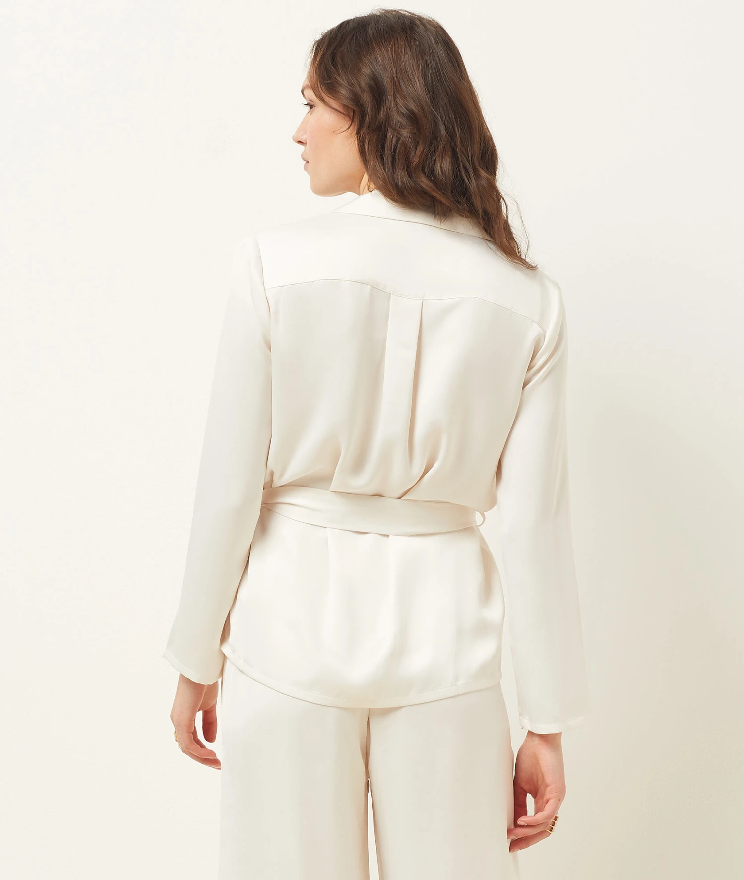 La chemise de pyjama se fait chic dans cette version nouée et satinée, à adopter en total look avec le pantalon coordonné.