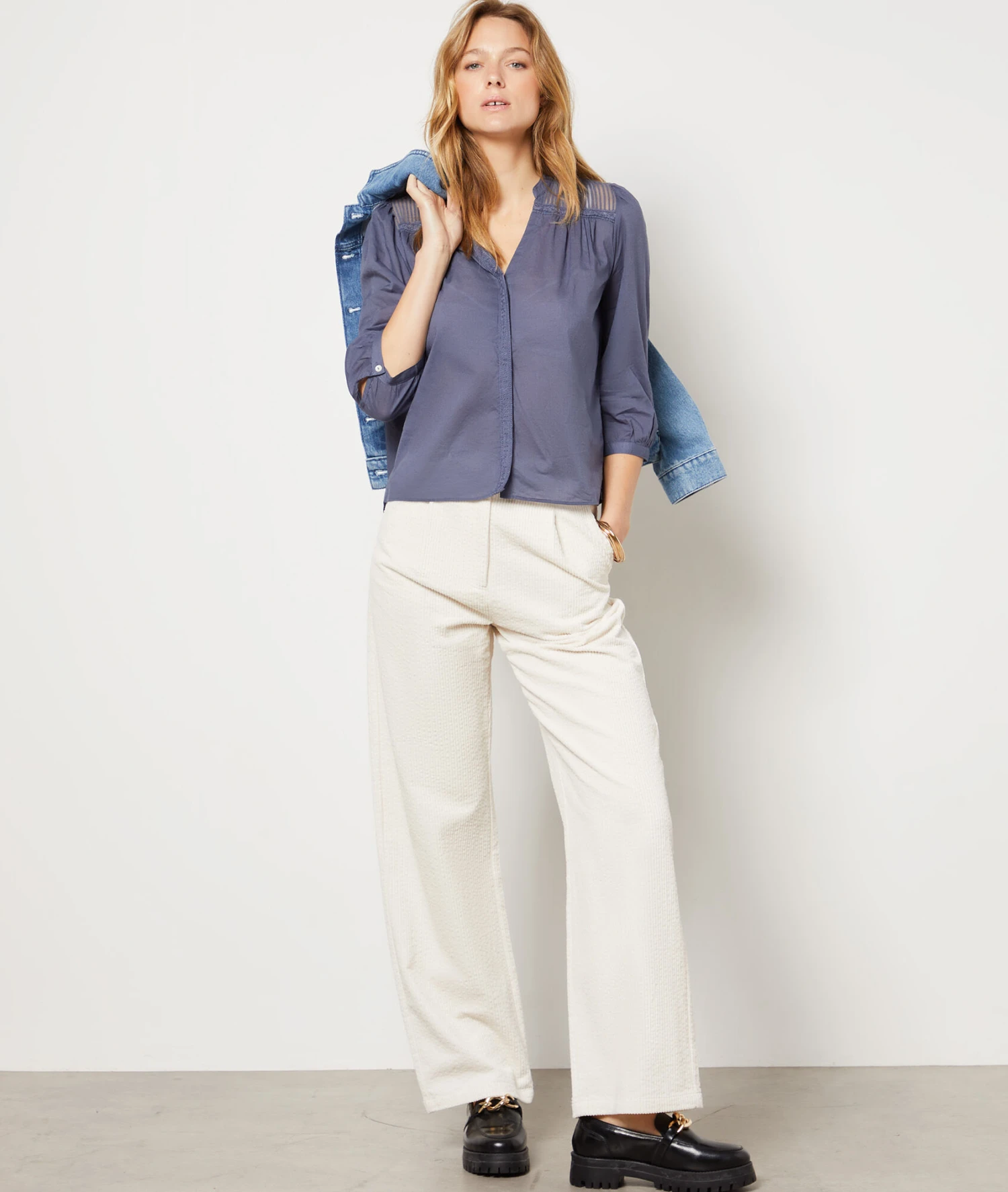 De minutieux détails brodés se dévoilent sur ce chemisier en coton légèrement plissé. Il est muni de manches trois quarts se fermant à l’aide d’un bouton, ainsi que d’un col tunisien laissant apparaître un décolleté en V délicat. Renforcez l’esprit romantique en l’associant à un bandeau dans les cheveux et un panier en osier.