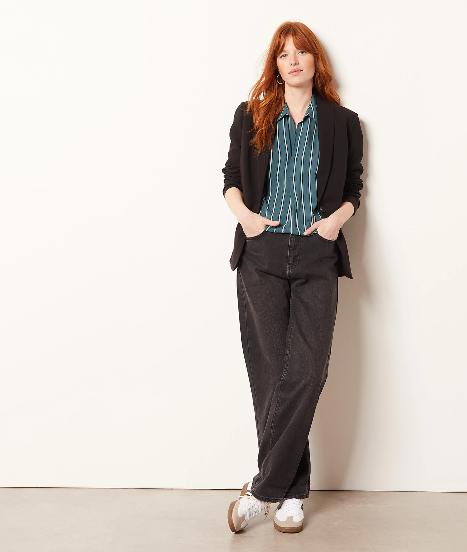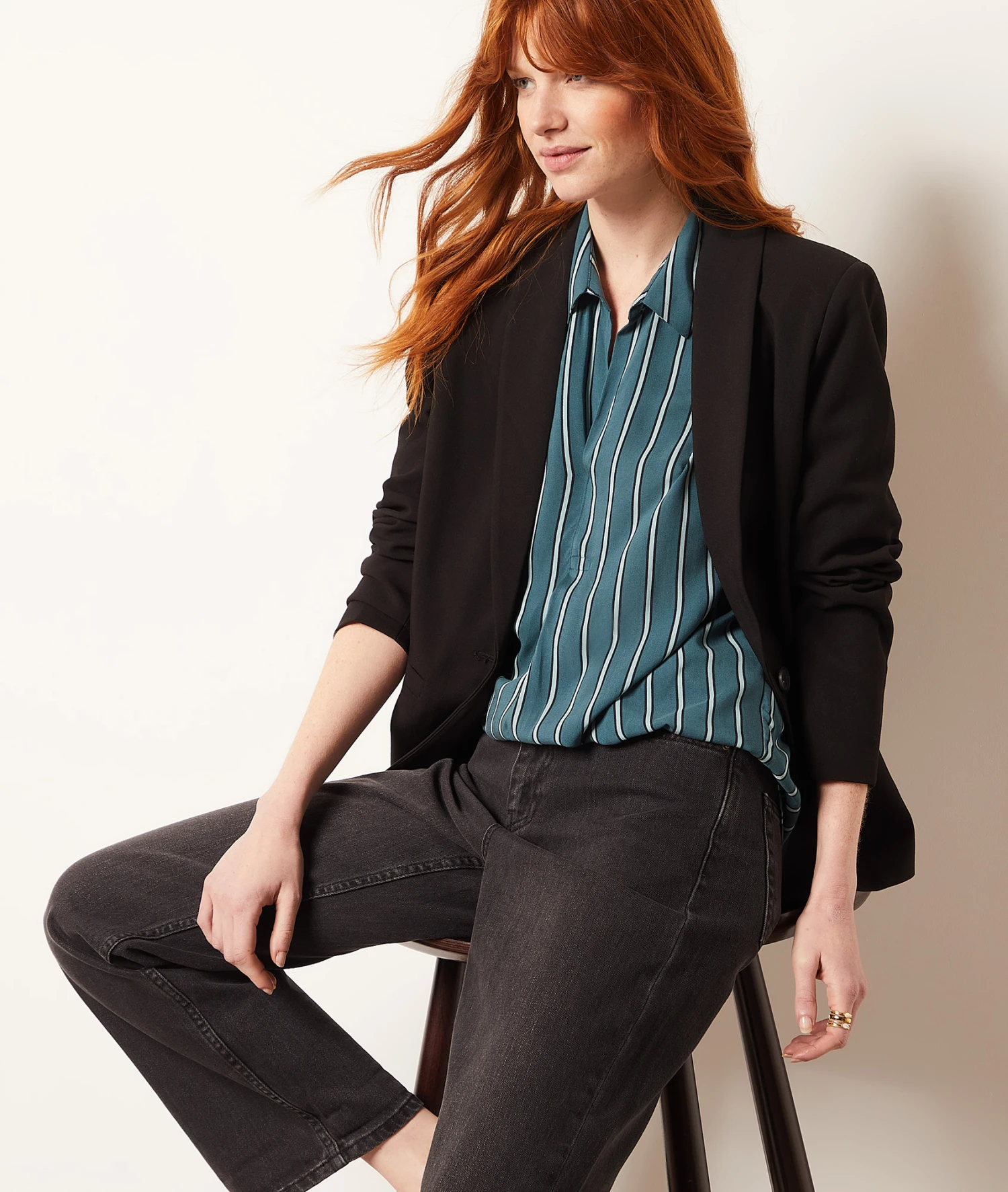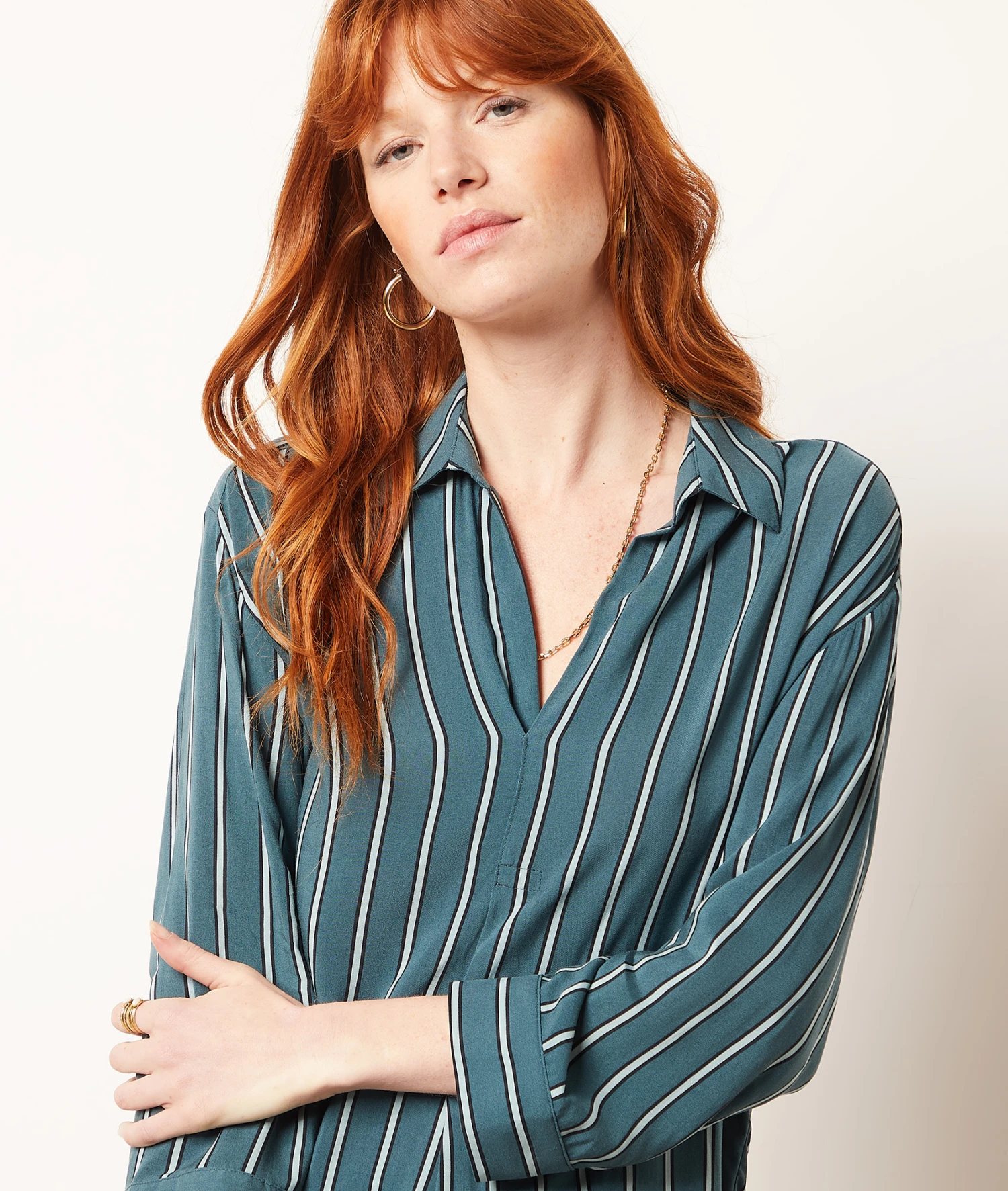 Cette blouse à rayures et manches trois-quarts apporte une note féminine dans le vestiaire workwear. Elle dévoile un col chemisier et une matière fluide, à glisser sous une veste structurée.
