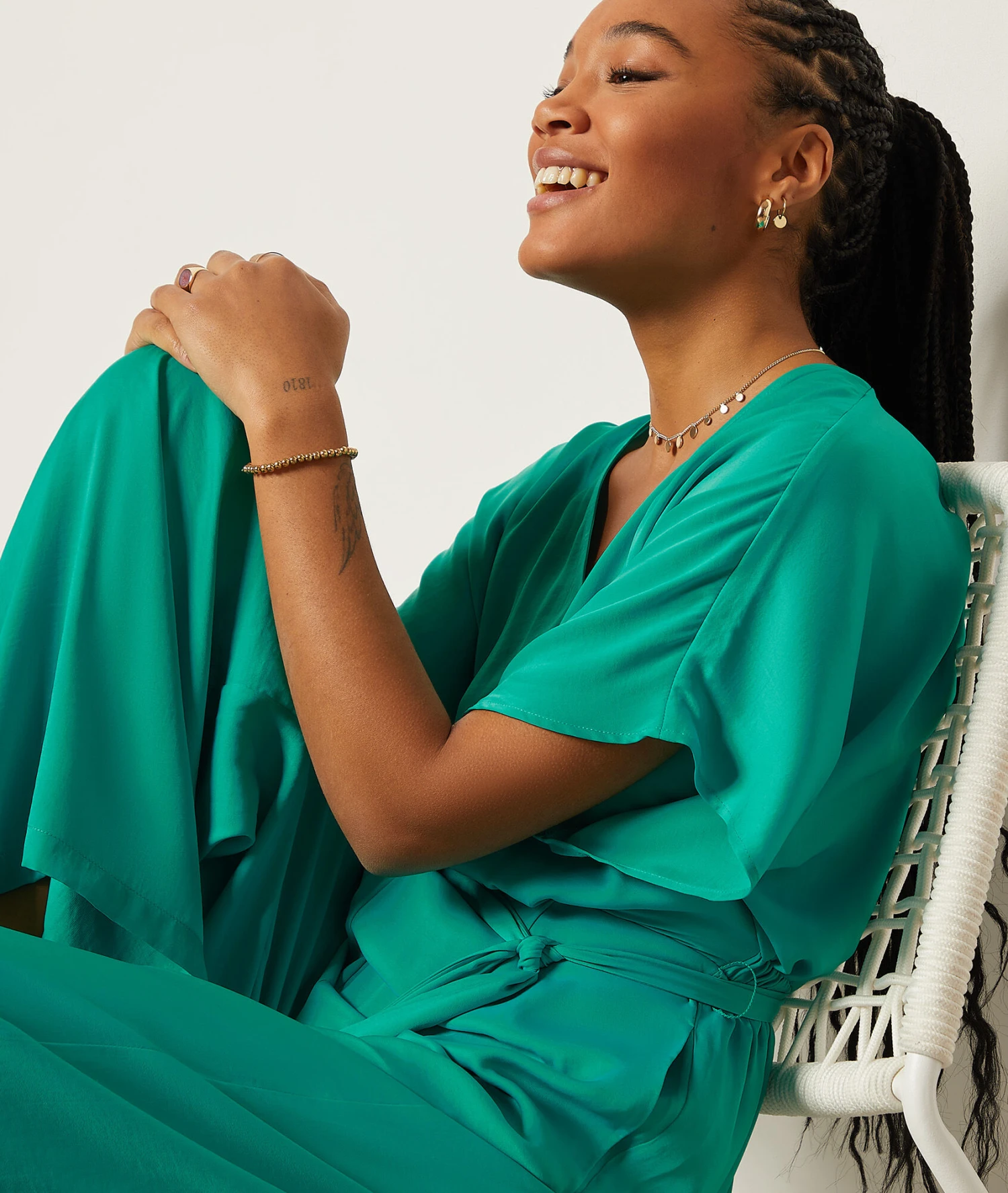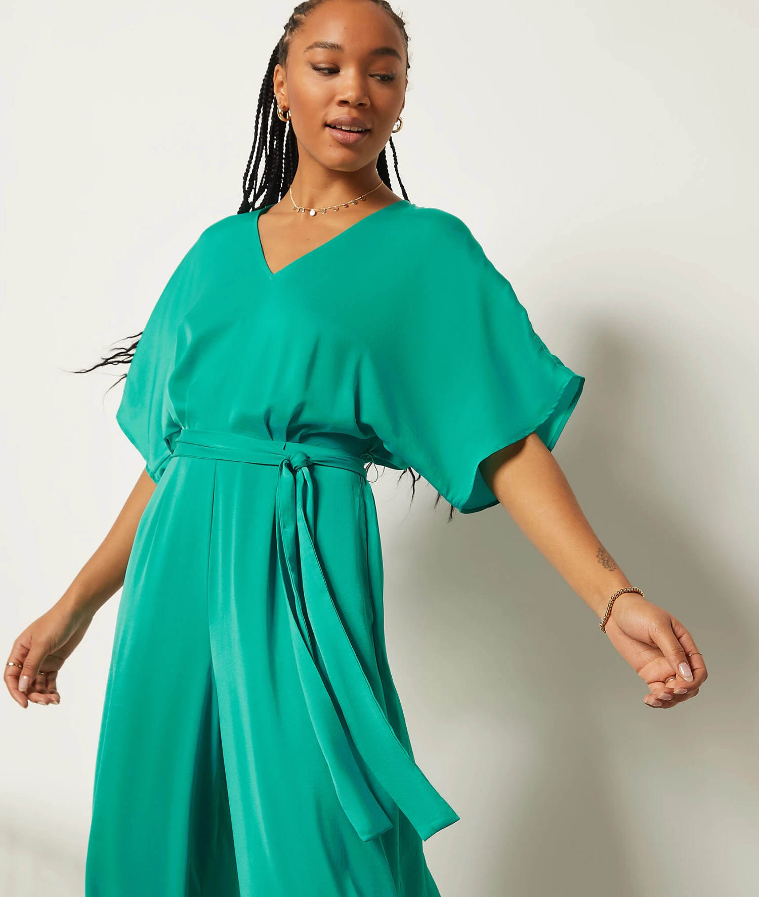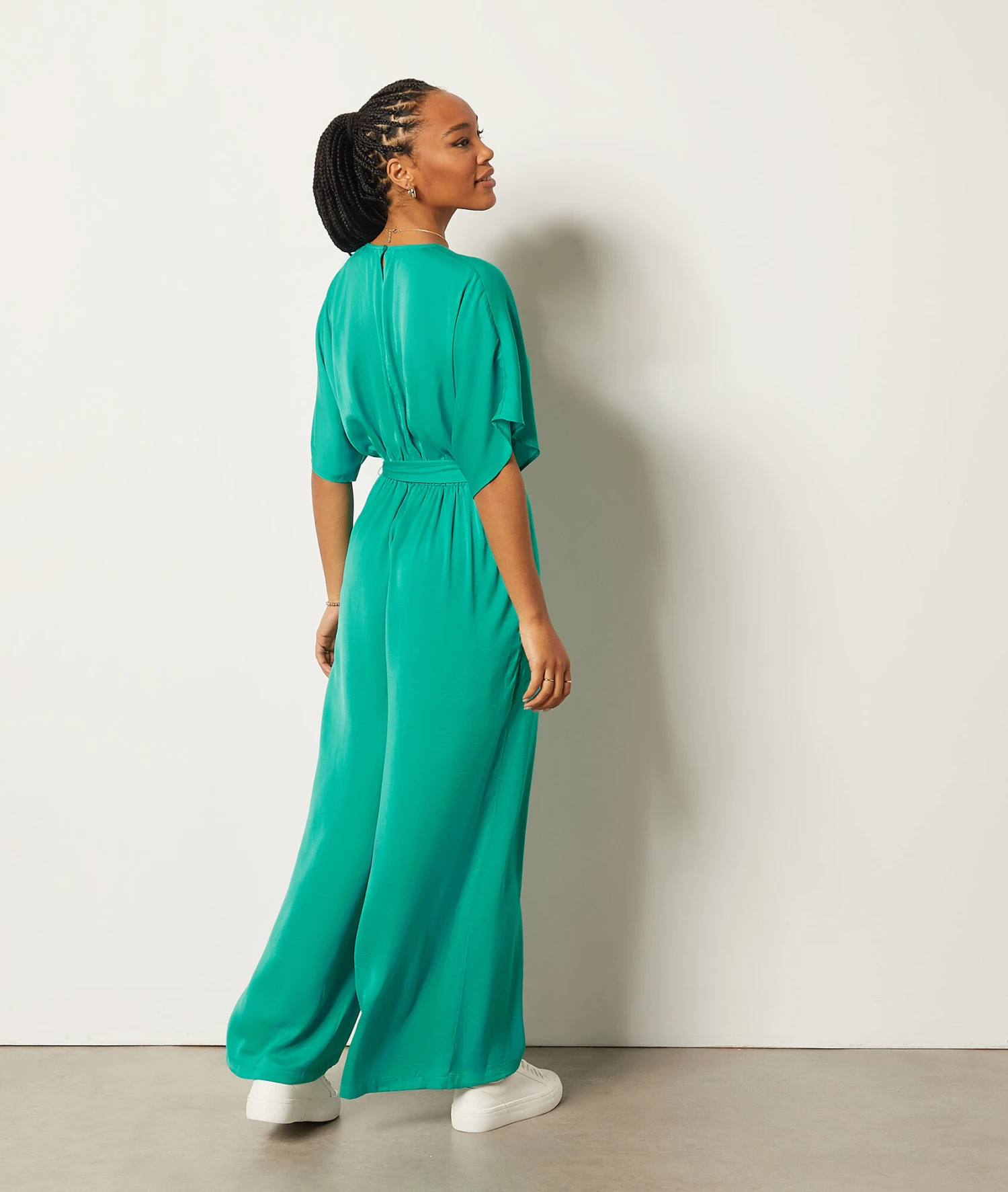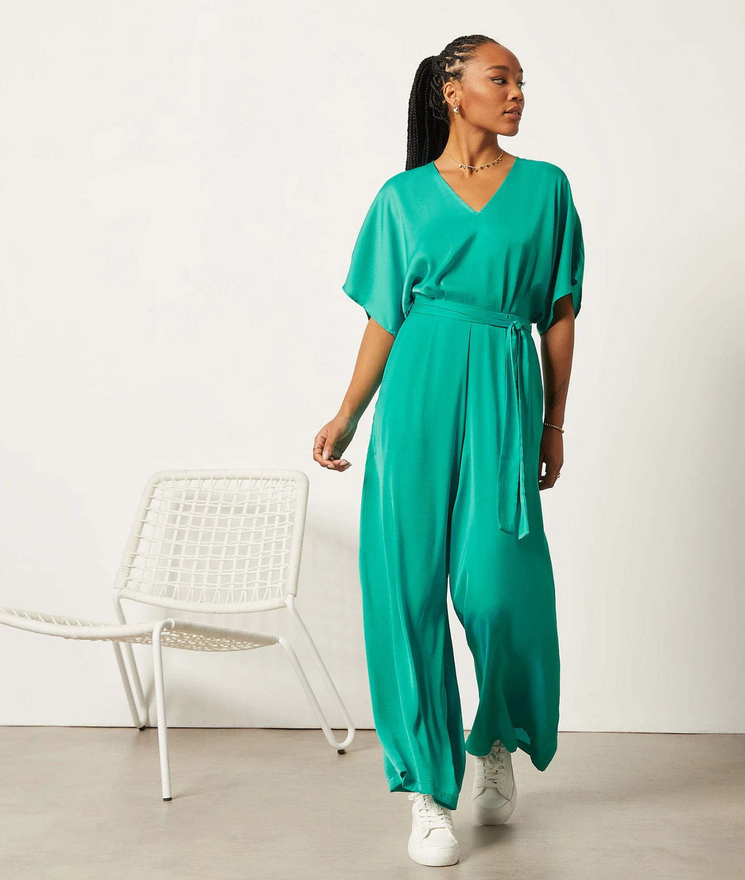 La combinaison pantalon fluide et élégante à adopter en mode casual avec des sneakers, et en version habillée avec une paire de sandales à talons. Munie d’un col en V et de manches courtes, elle est cintrée et dévoile une silhouette sublimée.