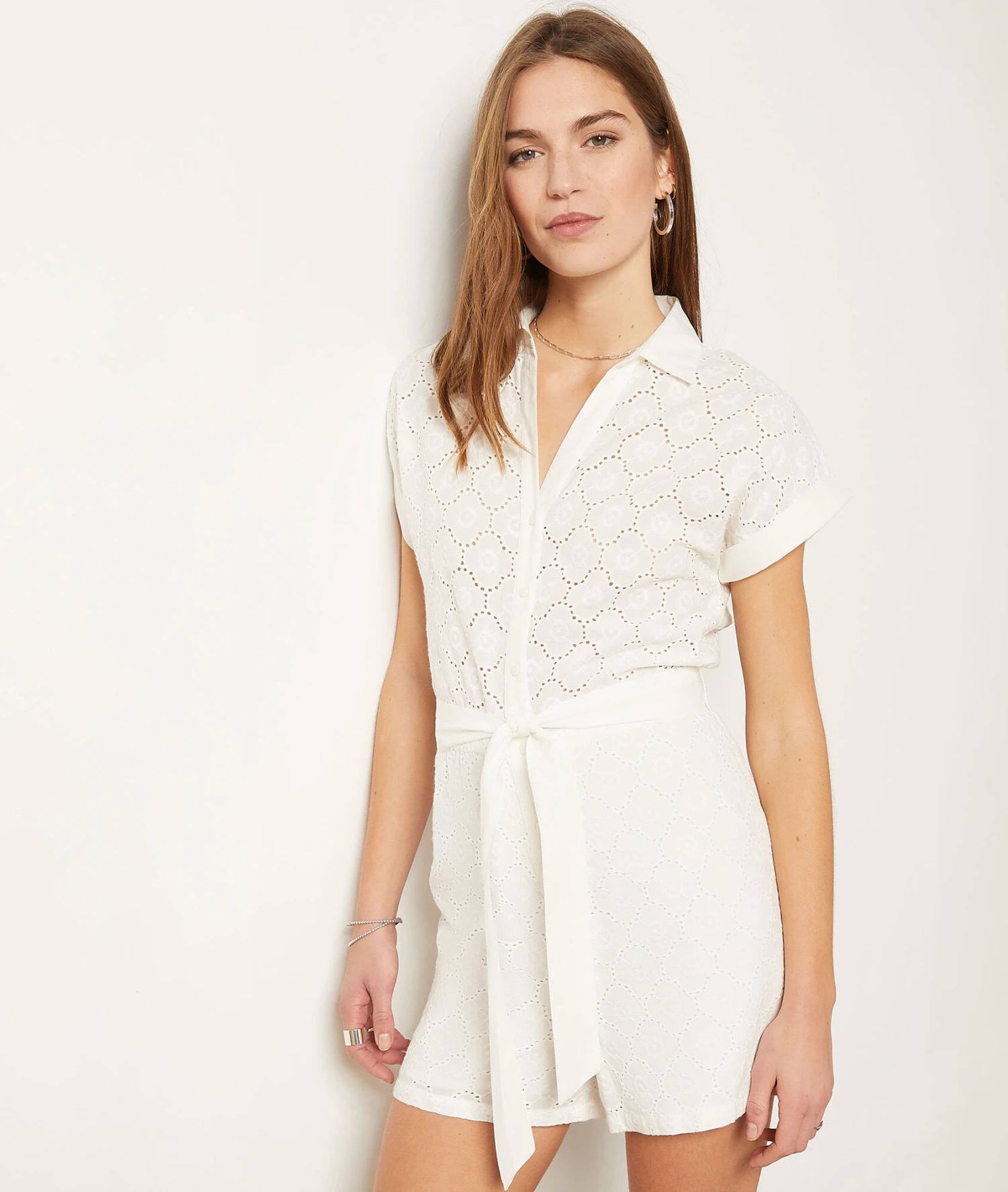 Craquez pour la douceur de cette combishort en coton et broderie anglaise. Munie d’un col chemisier et de manches courtes, elle est idéale à porter avec des baskets pour un look décontracté chic. Accessoirisée d’une ceinture, elle se porte cintrée pour une silhouette structurée.