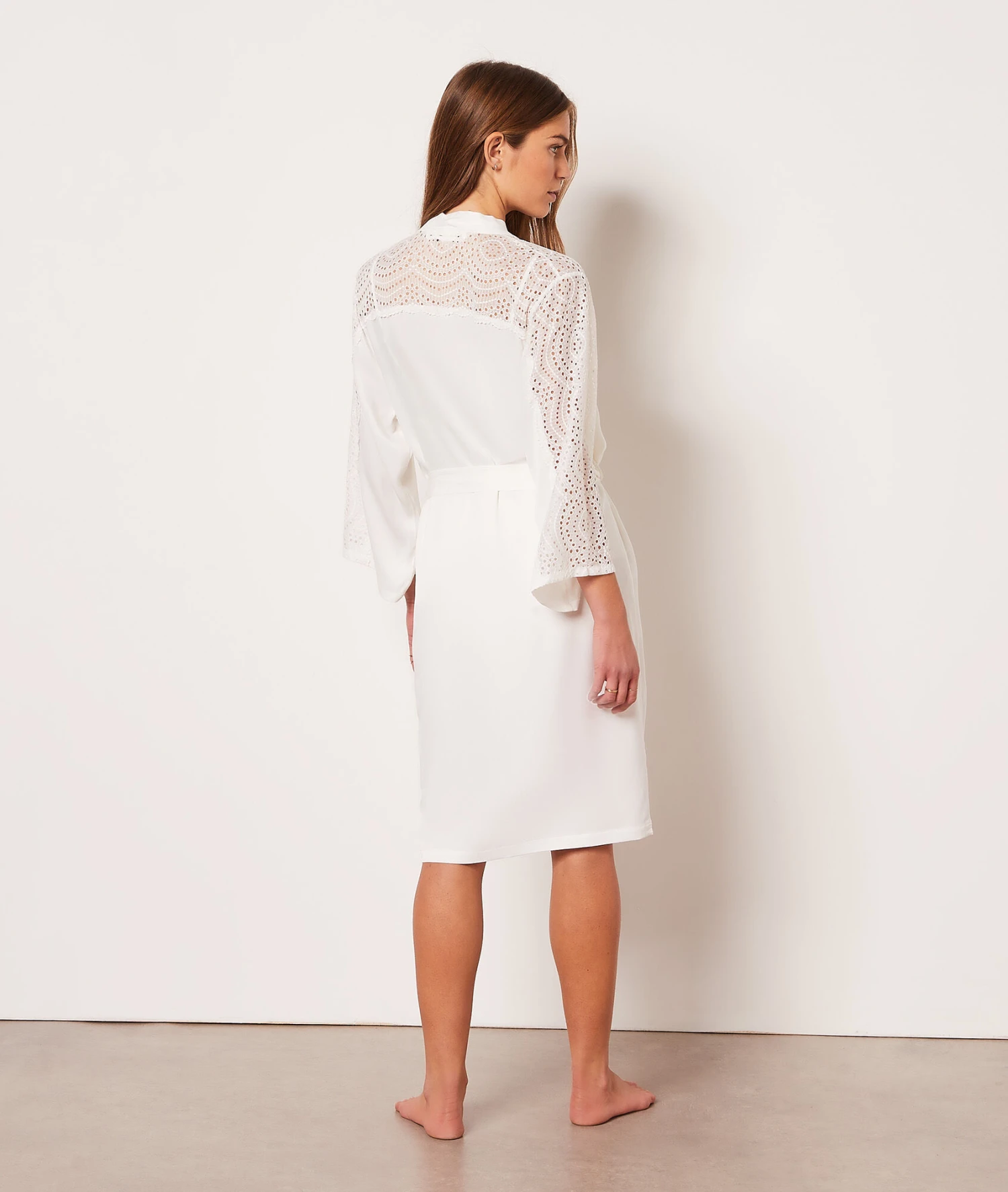 Ce déshabillé dévoile une ligne élégante et des découpes en dentelle sublime. Muni de manches longues et d’une ceinture à nouer, il s’enfile sur un pyjama en soie pour des nuits très douces.