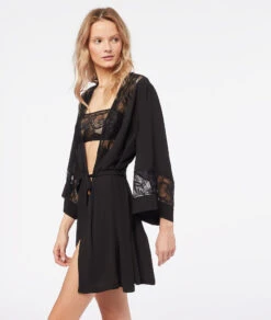 Délicatement satiné et orné de dentelle, ce déshabillé léger se glisse sur votre lingerie favorite pour un look de nuit chic et sensuel.