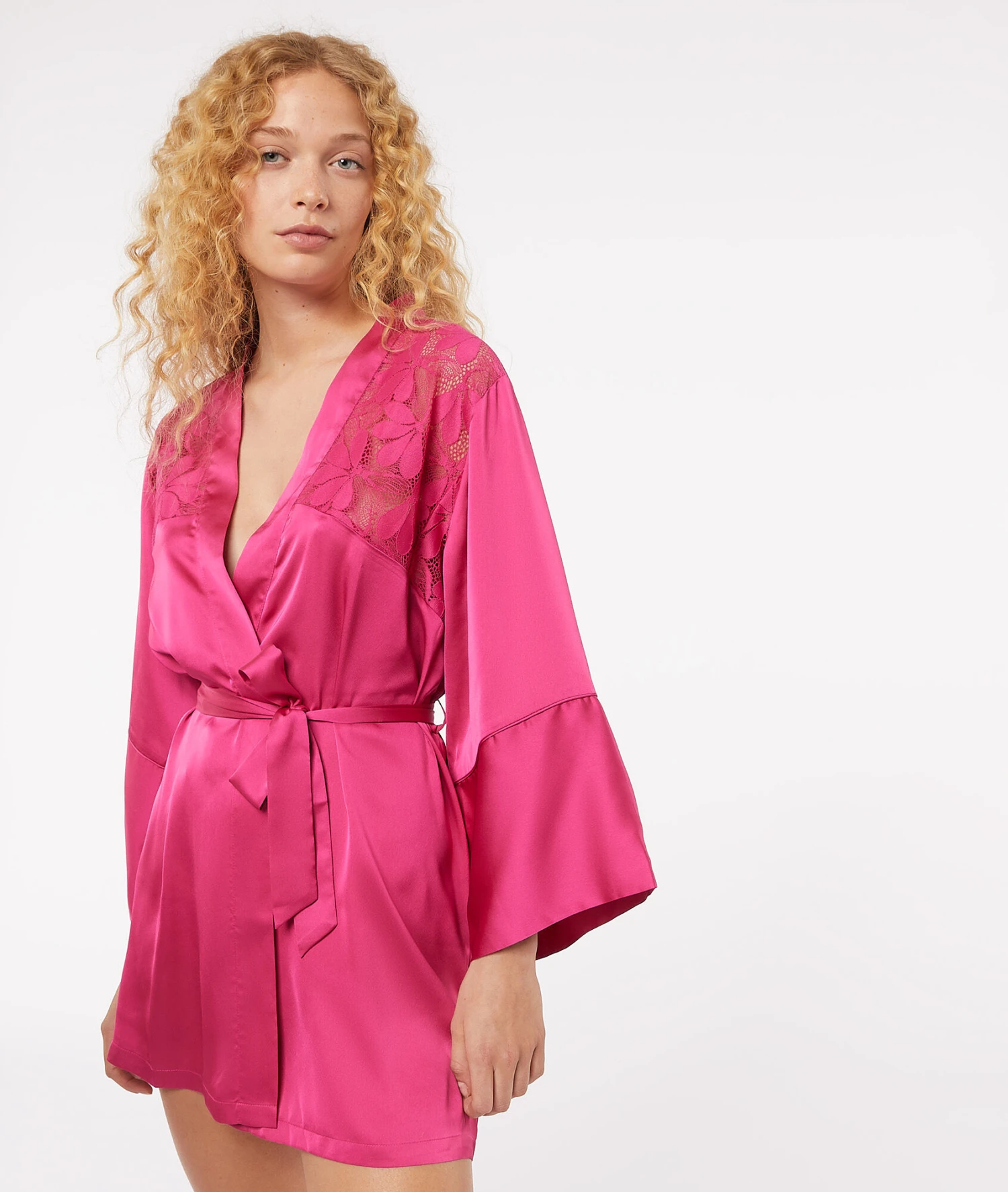 Délicatement satiné, ce déshabillé à la couleur acidulée dévoile des empiècements de dentelle fleurie aux épaules. Glissez le sur une lingerie sensuelle, ou sur un pyjama cosy.