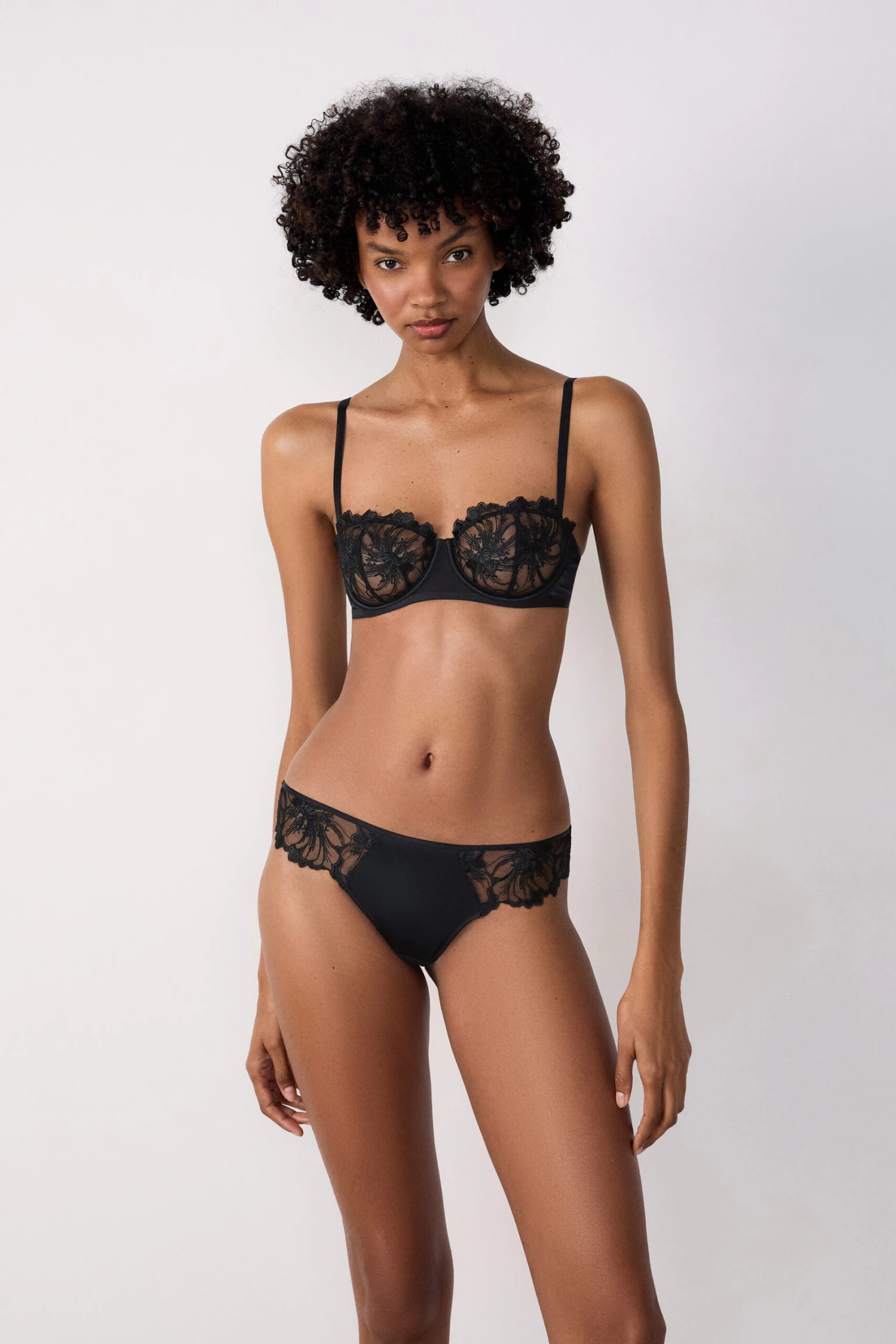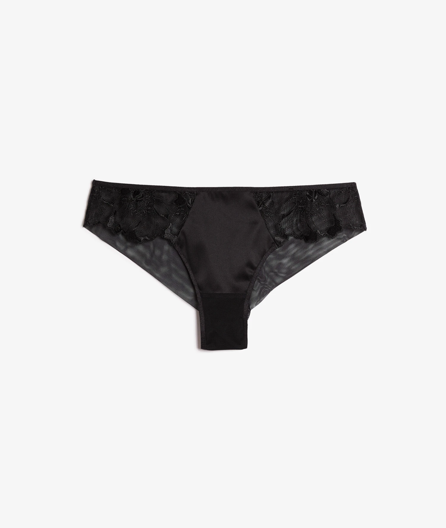 Une matière délicatement satinée s’entoure de tulle brodé. Des motifs fleuris se dévoilent en transparence et sublime cette pièce de lingerie féminine et sensuelle.