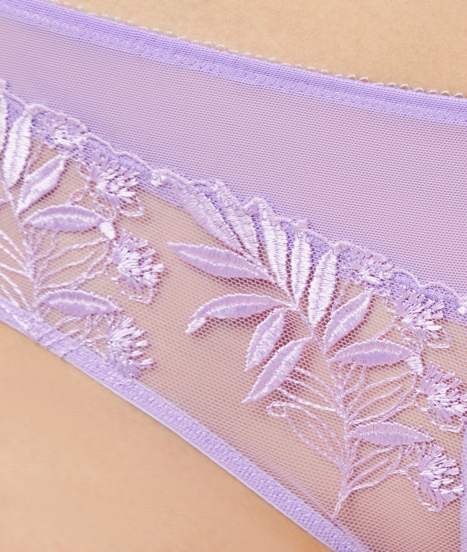 Des broderies fleuries se dévoilent sur ce shorty en tulle transparent à la couleur acidulée.