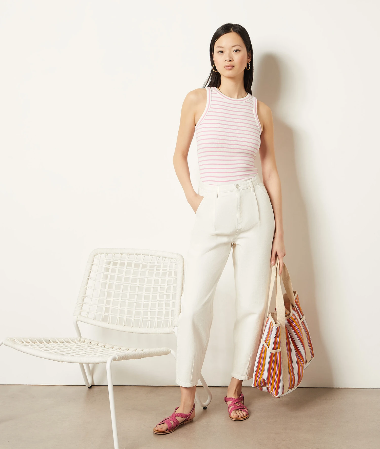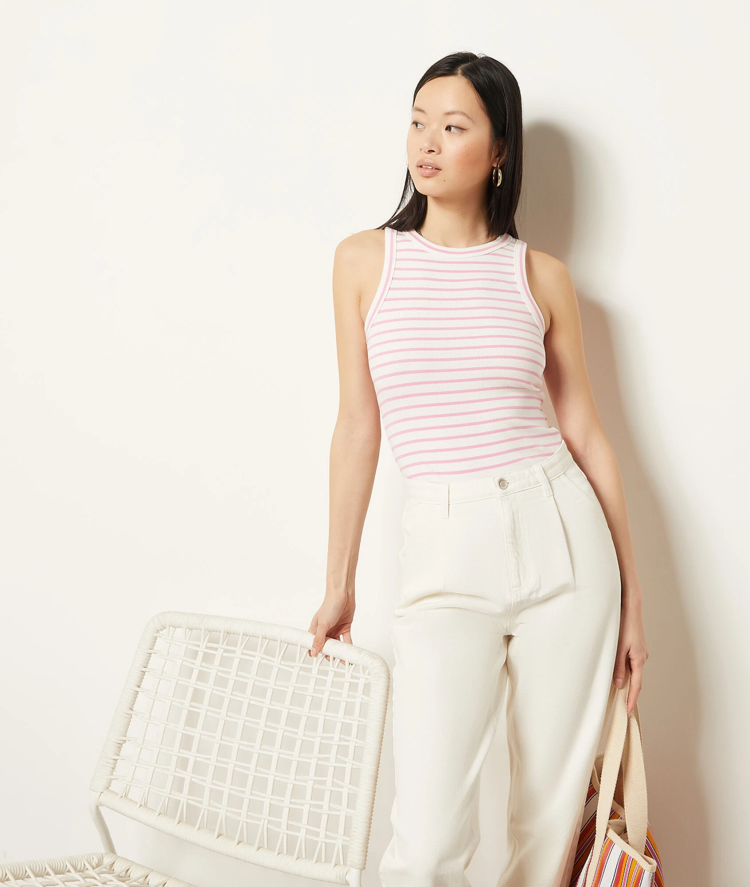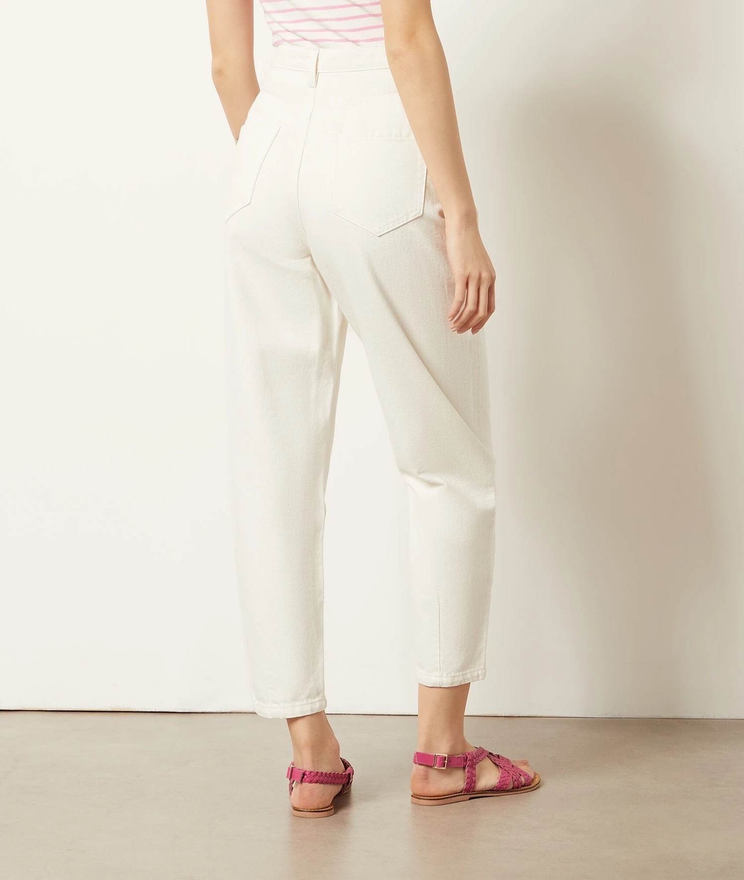 Il revient dès l’arrivée des beaux jours, le jean blanc se décline cette saison dans une coupe carotte. Taille haute ajustée et pinces sur les côtés, il flatte toutes les silhouettes.