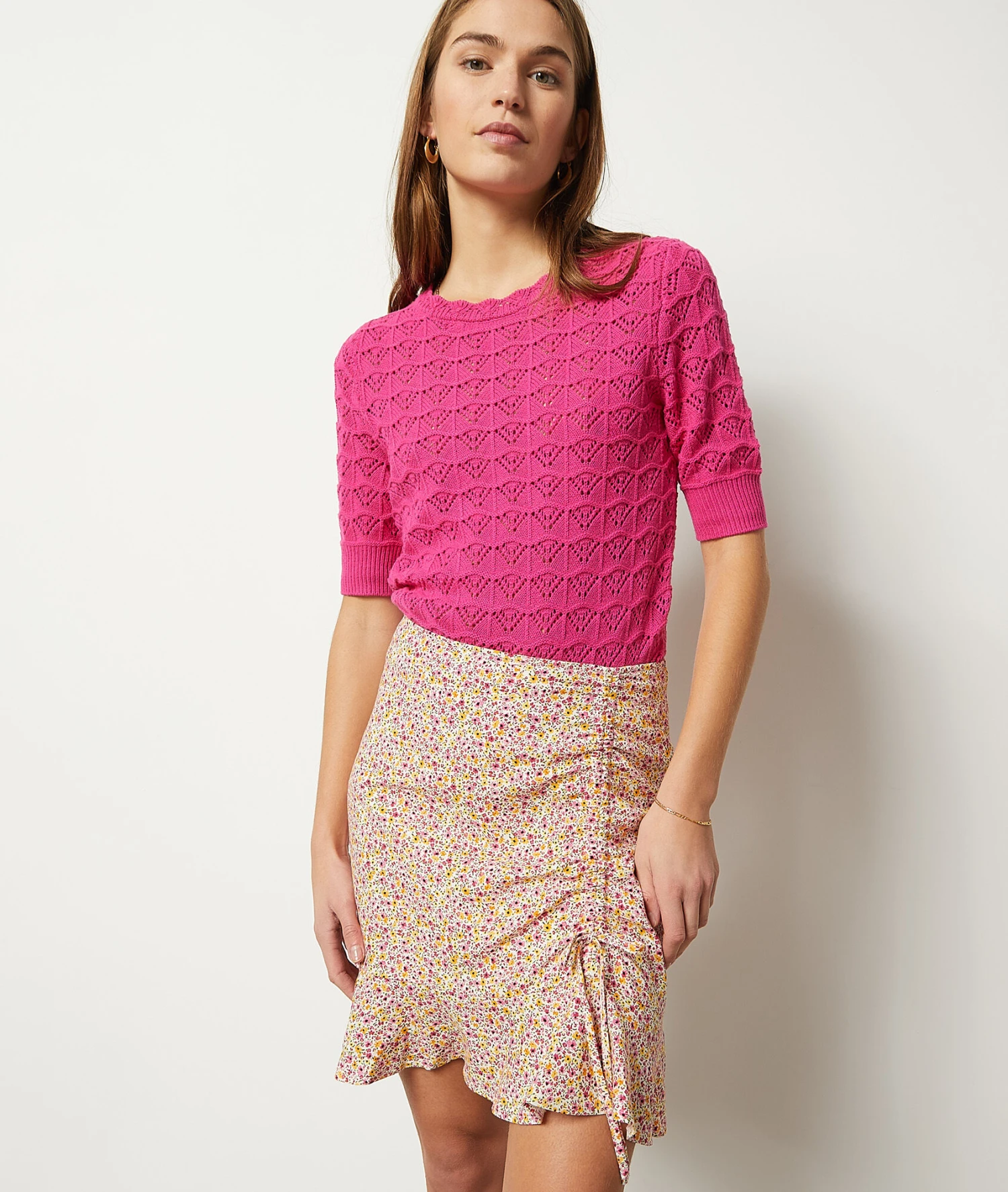 Cette jupe courte fleurie à effet drapé est munie d’un lien coulissant et de volants. A porter avec une maille pour un look féminin et sexy.