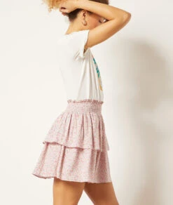 Légère et volantée, cette jupe courte dévoile un imprimé fleuri et une taille délicatement smockée.