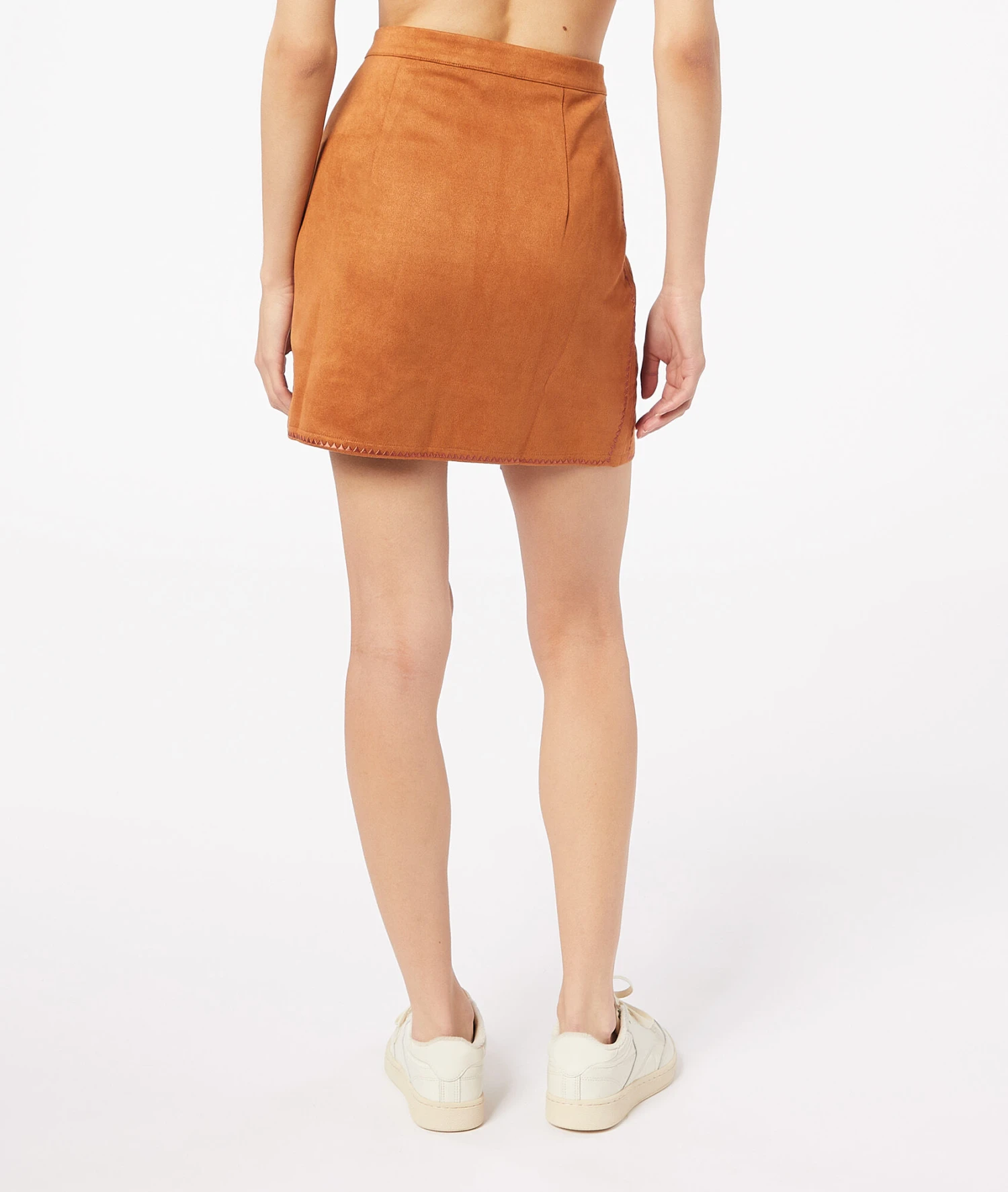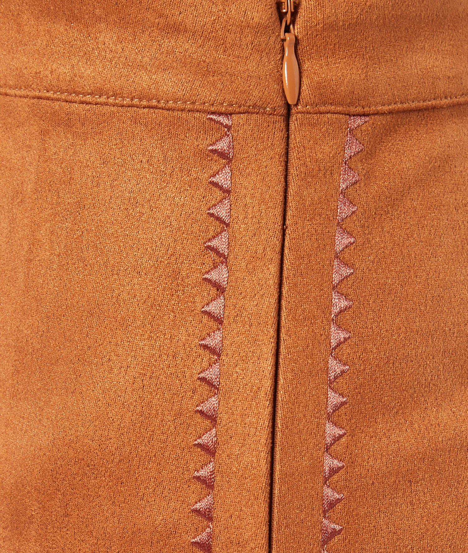 Effet cuir suédé pour cette jupe courte ornée de motifs contrastés sur les bords. Associez la a la veste coordonnée pour un total look audacieux.