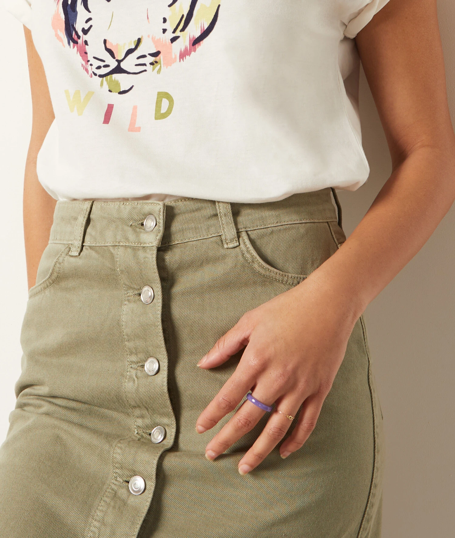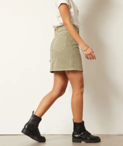 L’incontournable jupe en jean est revisitée en version kaki et boutonnée. Mixez la a des rangers pour un look casual.