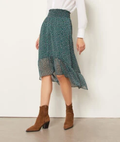Fluide et légère, cette jupe ultra féminine dévoile une découpe asymétrique, plus longue au dos. Mixée à une maille épaisse et une ceinture à boucle, elle donne de l’allure.