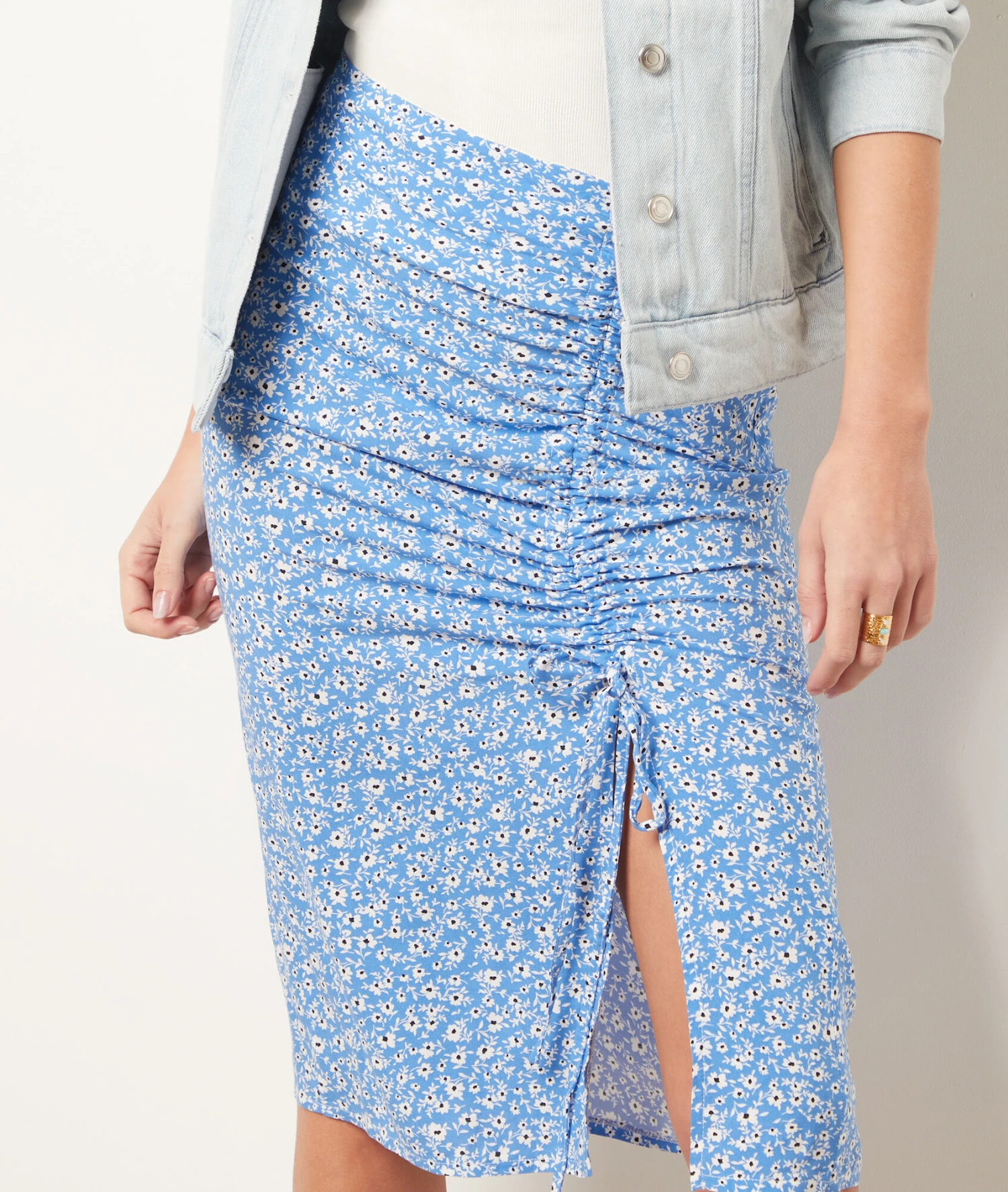 Fleurie, cette jupe midi est idéale pour les journées ensoleillées. Elle est munie de liens à froncer, laissant la possibilité de dévoiler une fente et se porte près du corps pour une silhouette dessinée et ultra sexy. Associez-la à des sandales pour un look décontracté ou à des talons pour vos soirées d’été.