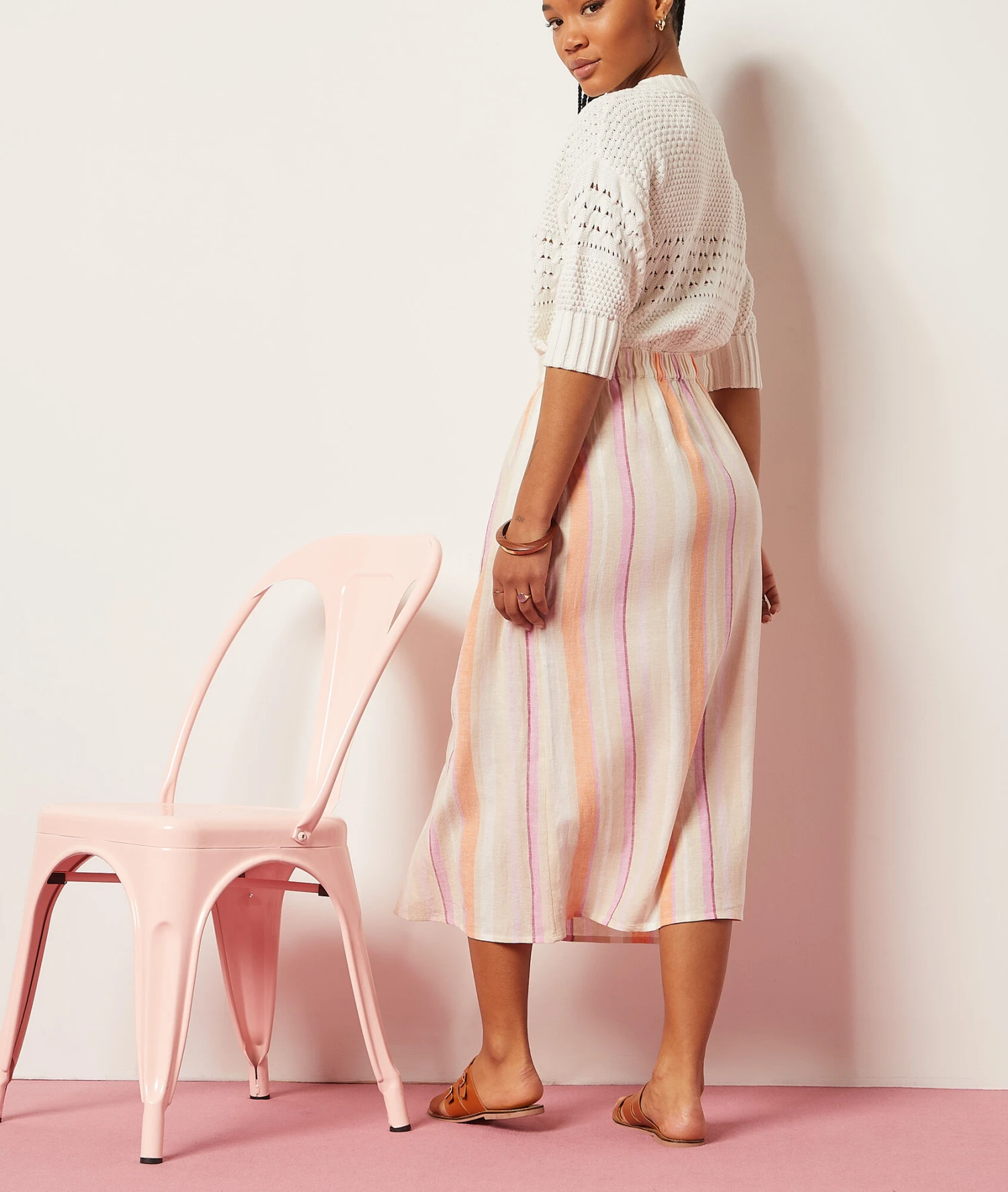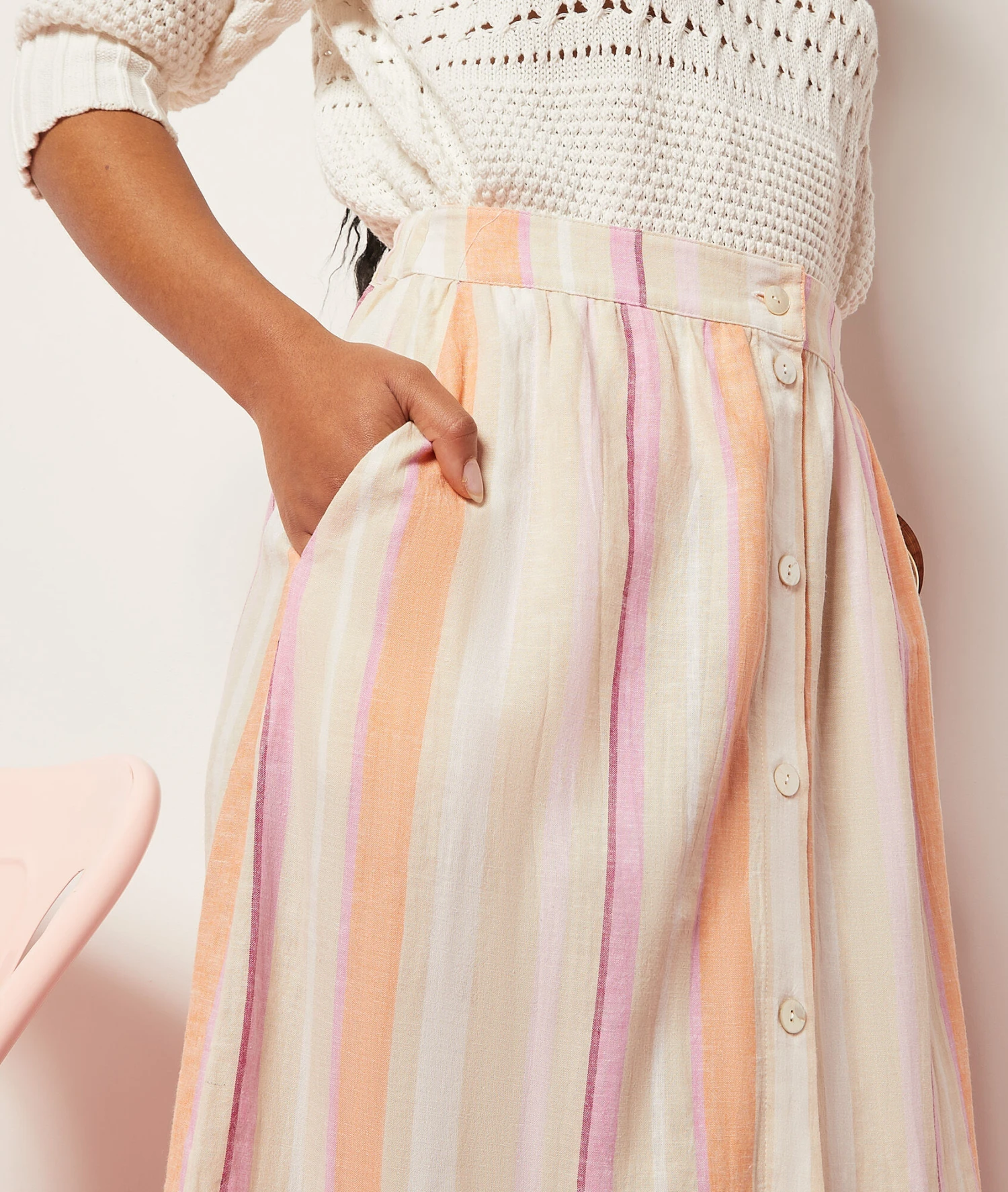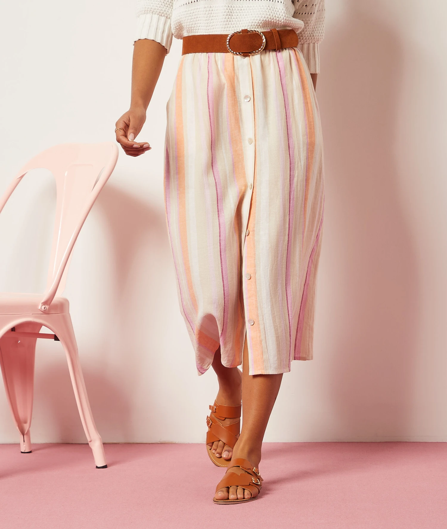 Munie d’une fermeture boutonnée, cette jupe midi taille haute se porte plus ou moins fendue en fonction de vos envies. Ornée de rayures aux couleurs douces, elle s’associe à un top noué ou à une maille légère pour créer de jolis looks d’été.