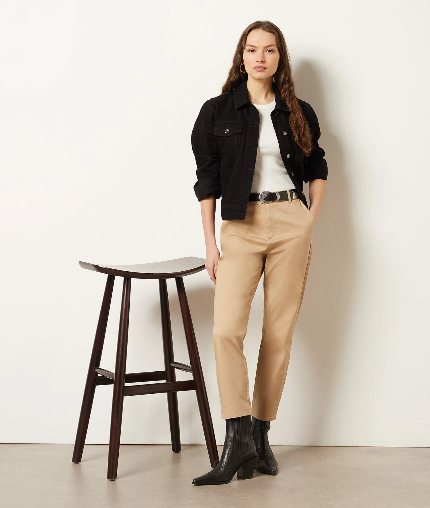 Ce pantalon coupe cigarette s’impose comme un incontournable du vestiaire. Accordé à une maille ou à une chemise, il sera la pièce tendance et élégante de votre outfit.