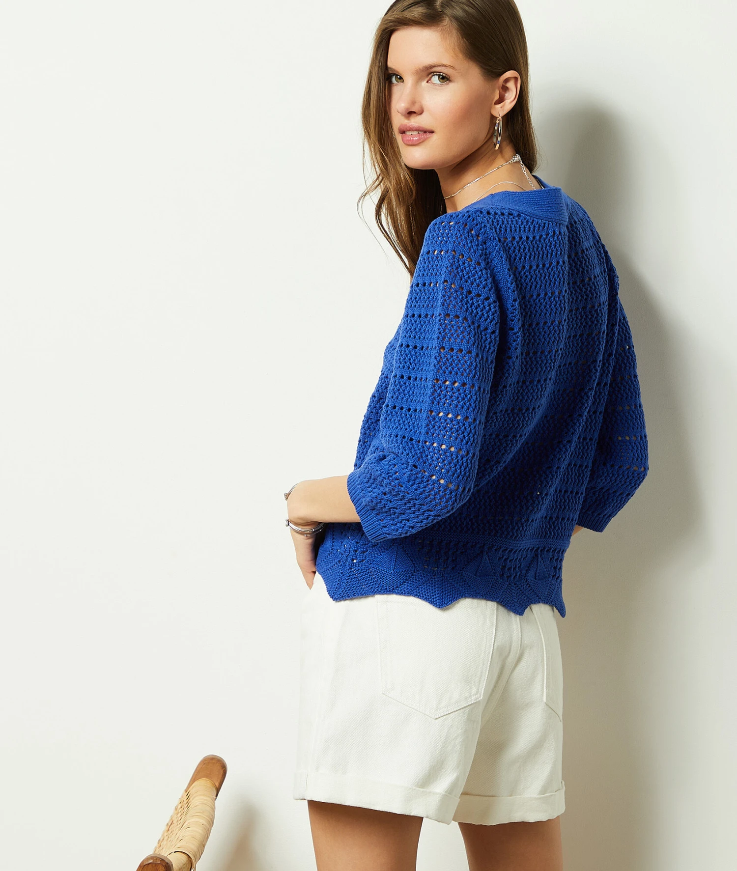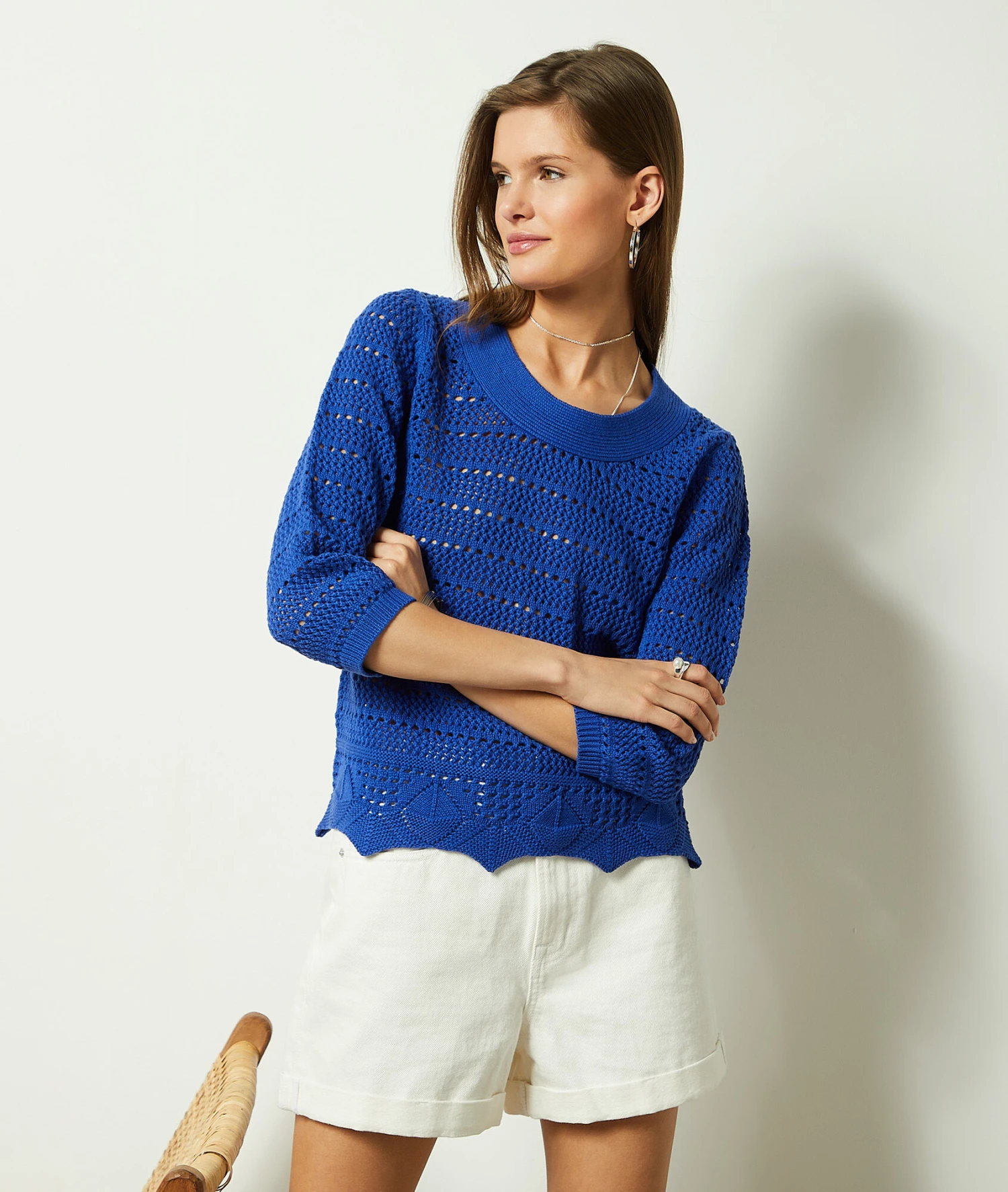 Ce pull en crochet va devenir le coup de cœur de vos soirées fraîches. 100% coton, ce pull à manches trois quarts, dévoile des détails délicatement ajourés ainsi qu’un jeu de motifs et de découpes sur le bas et sur le col rond.