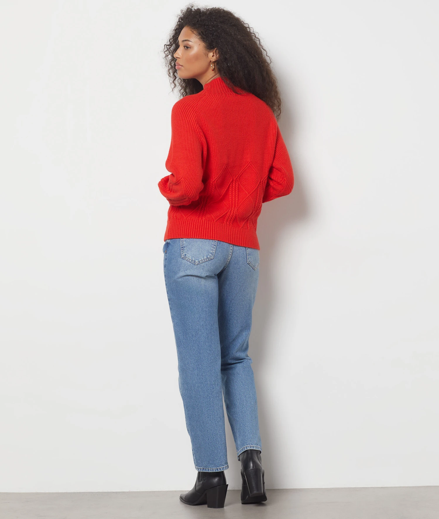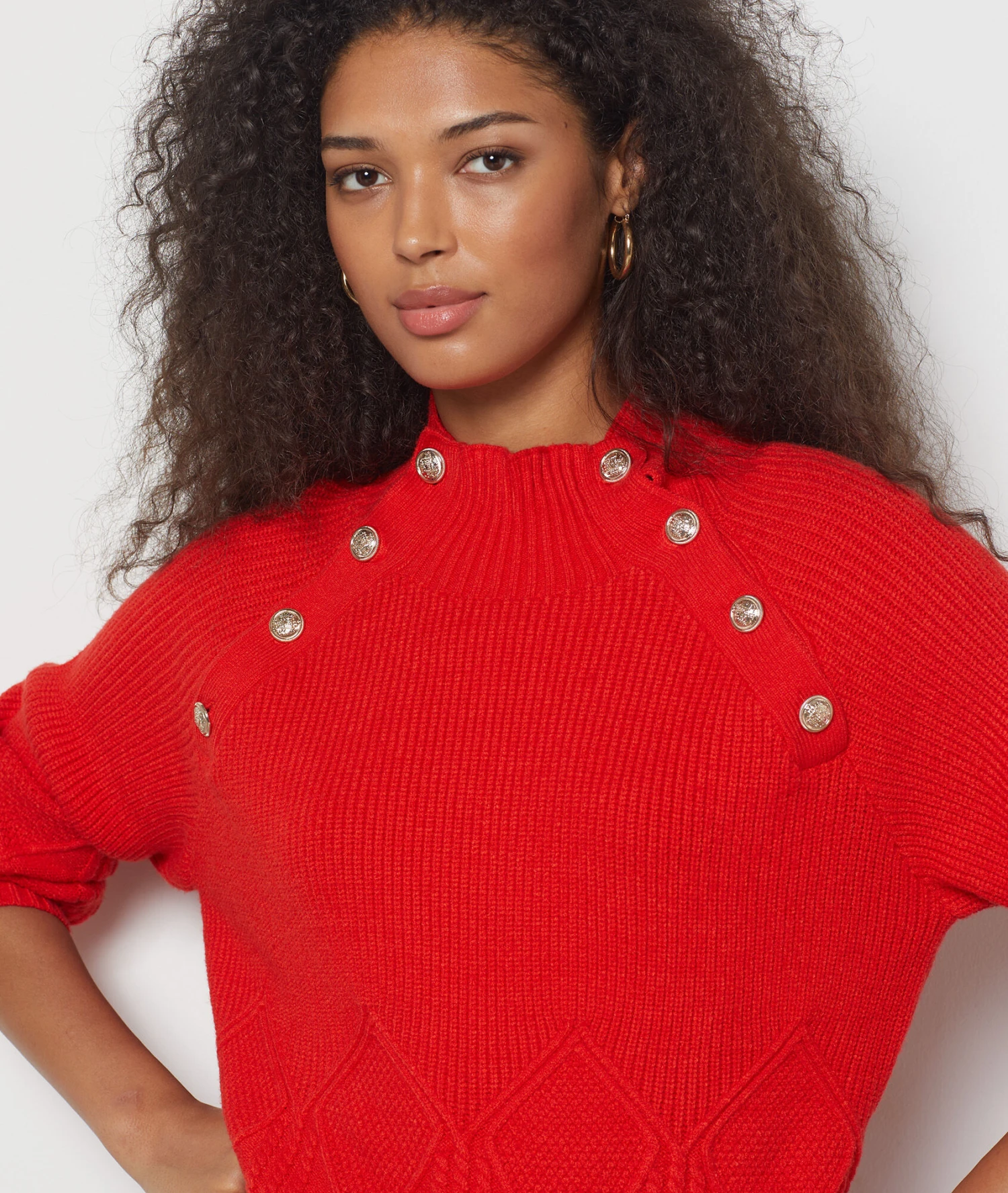 Muni d’un col montant, de manches longues et de jolis boutons dorés, ce pull confectionné en maille torsadée dévoile des motifs géométriques. Un incontournable de votre vestiaire d’hiver.
