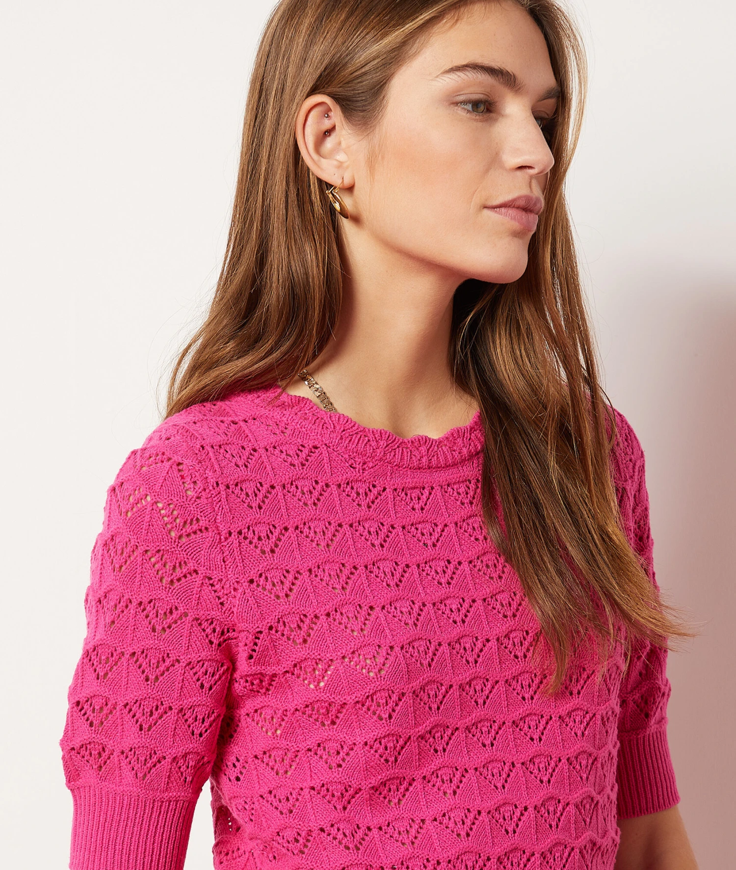 Ce pull en coton à col rond est muni de manches courtes et dévoile des détails ajourés pour un outfit ultra stylé et féminin.