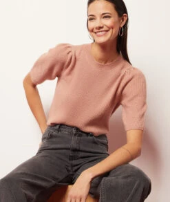 Manches courtes bouffantes et maille douce pour ce pull côtelé muni d’un col rond, à adopter dès la mi-saison.