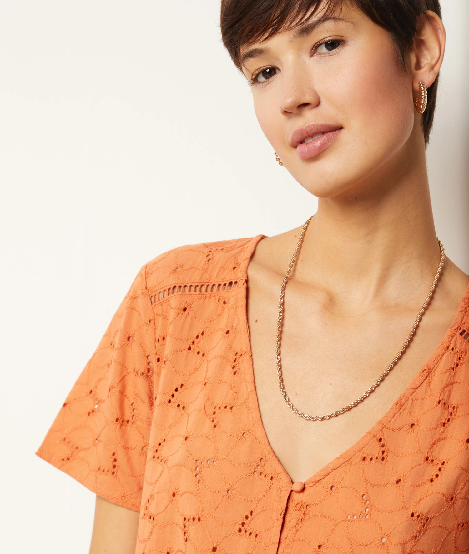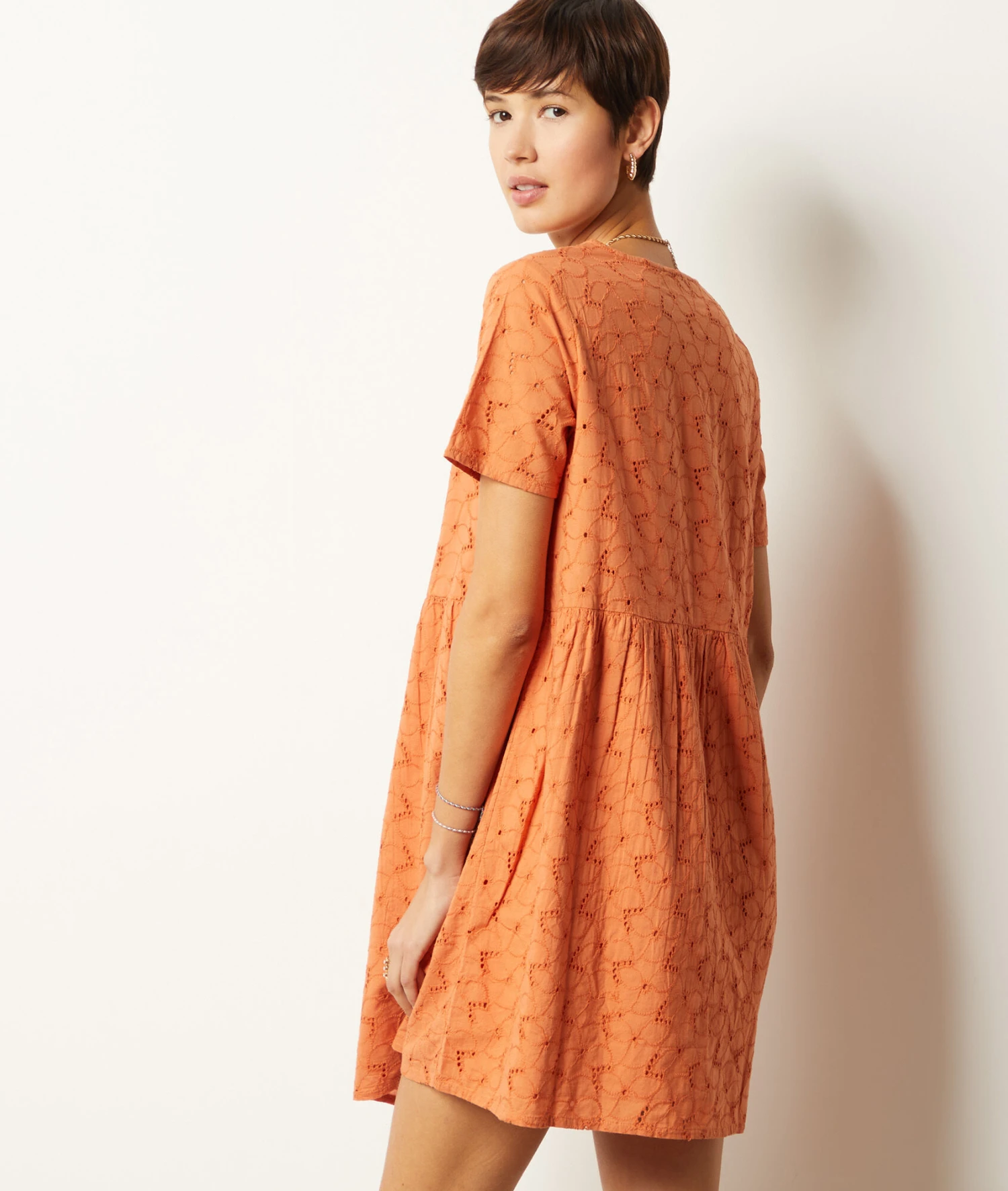 L’été sera ensoleillé. Le studio Etam a imaginé une robe courte vitaminée aux inspirations romantiques. Elle est ornée de broderies anglaises délicatement ajourées, dévoilant un peu plus la peau. Munie d’une encolure en V, de manches courtes et d’un bas de jupe volanté, elle promet des looks acidulés pour l’arrivée de l’été.