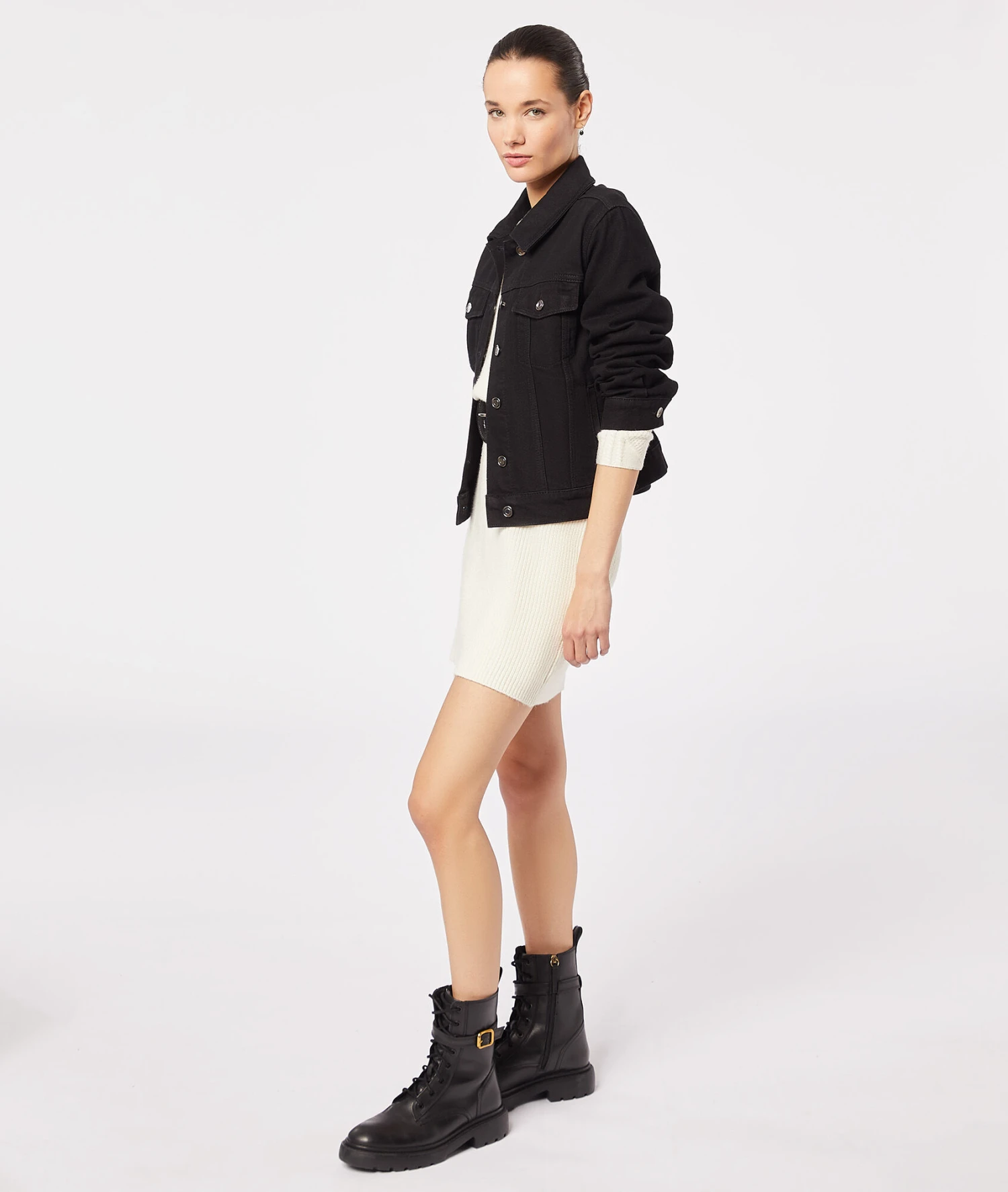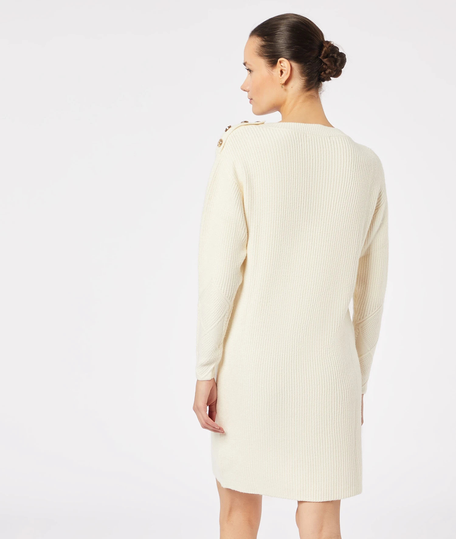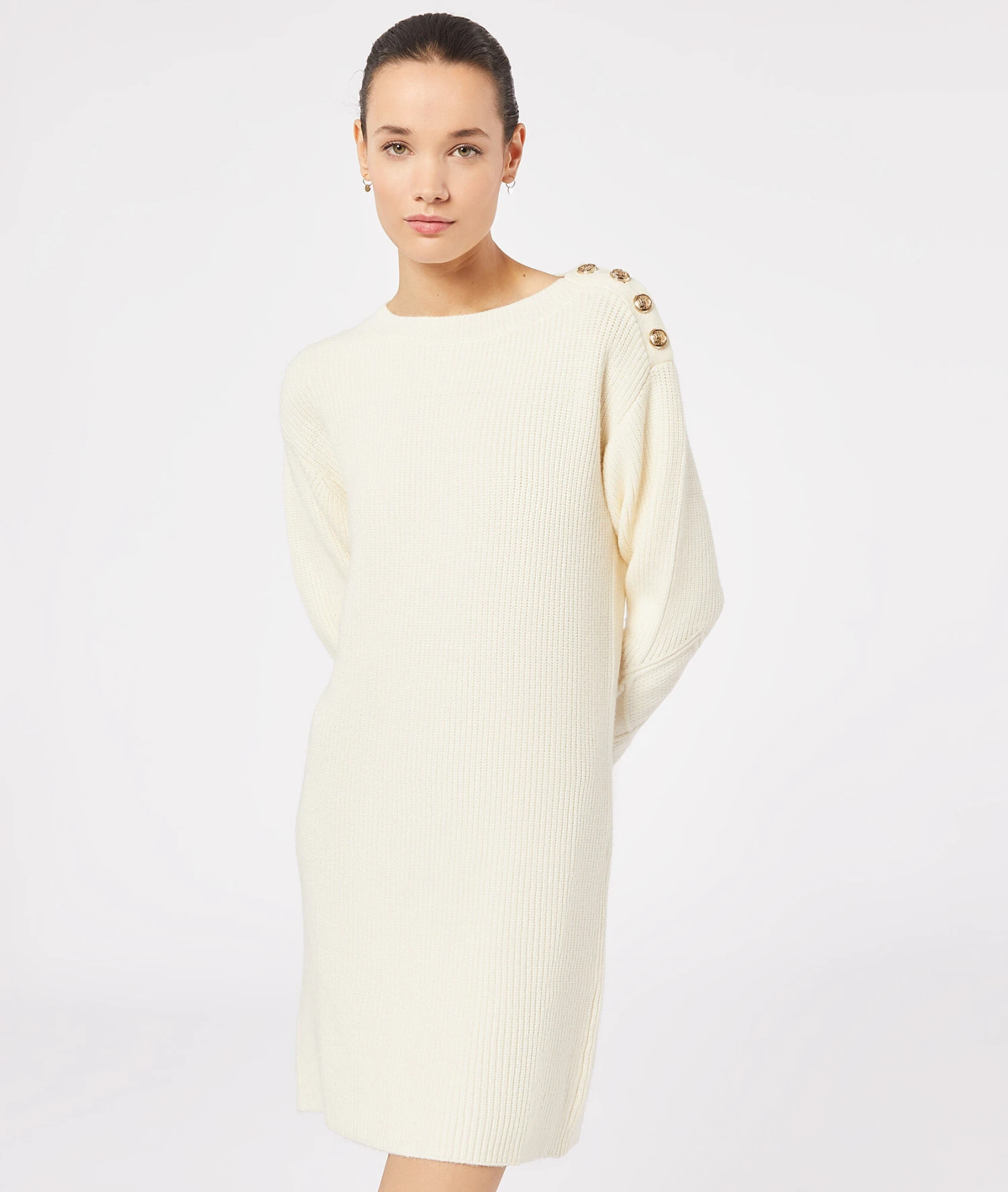 Une robe en maille à col rond et manches longues, ornée de boutons au niveau à l’épaule. A porter avec des cuissardes ou des bottines pour un look casual/chic.