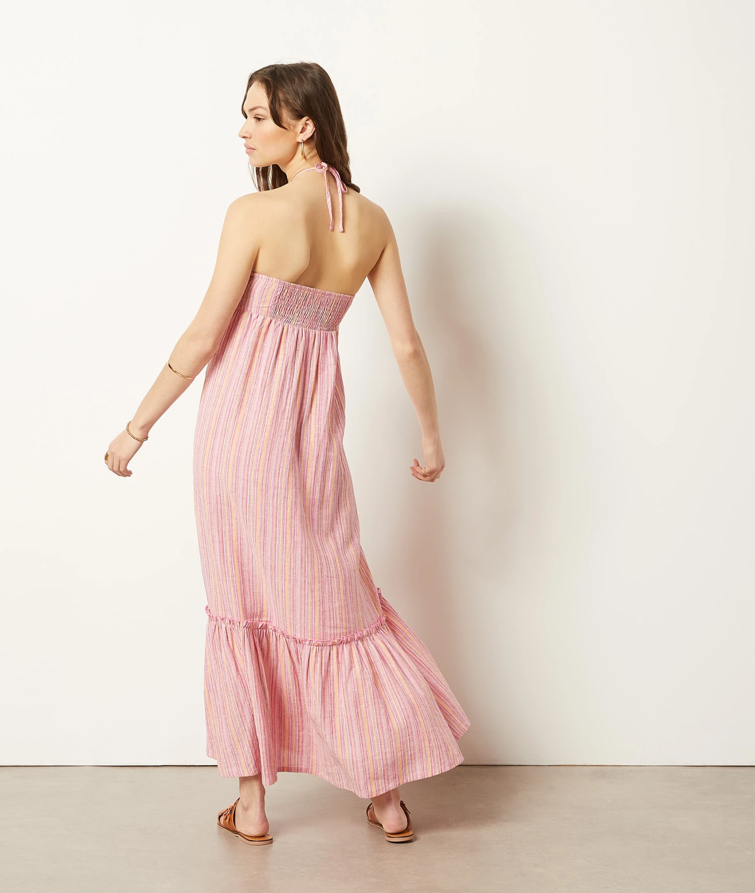 Un vrai shot de vitamines. Cette robe longue ornée d’un imprimé rayé dévoile un décolleté bustier noué par de jolies bretelles. Robe incontournable de la mi-saison, elle s’associe facilement à des sandales compensées.