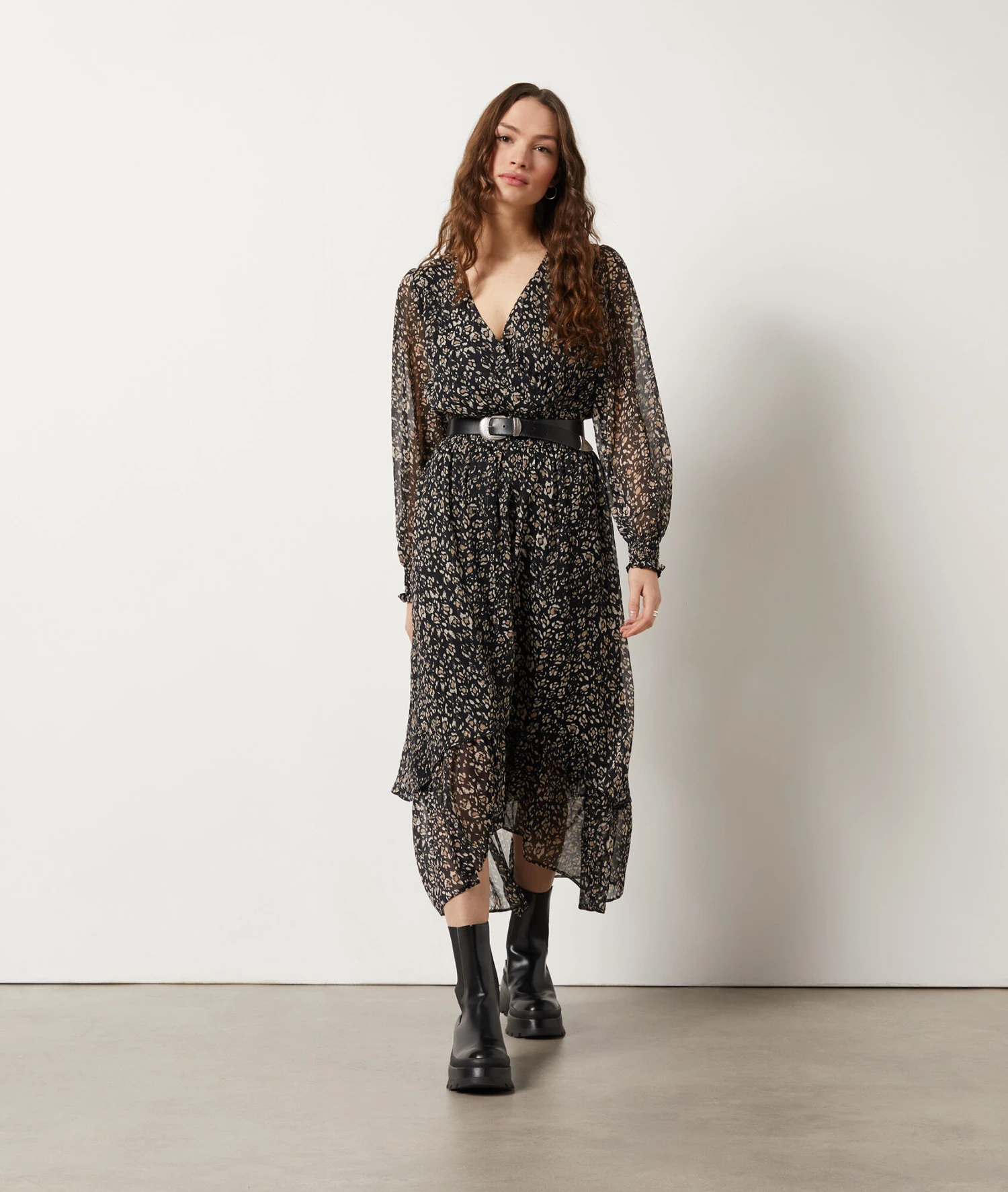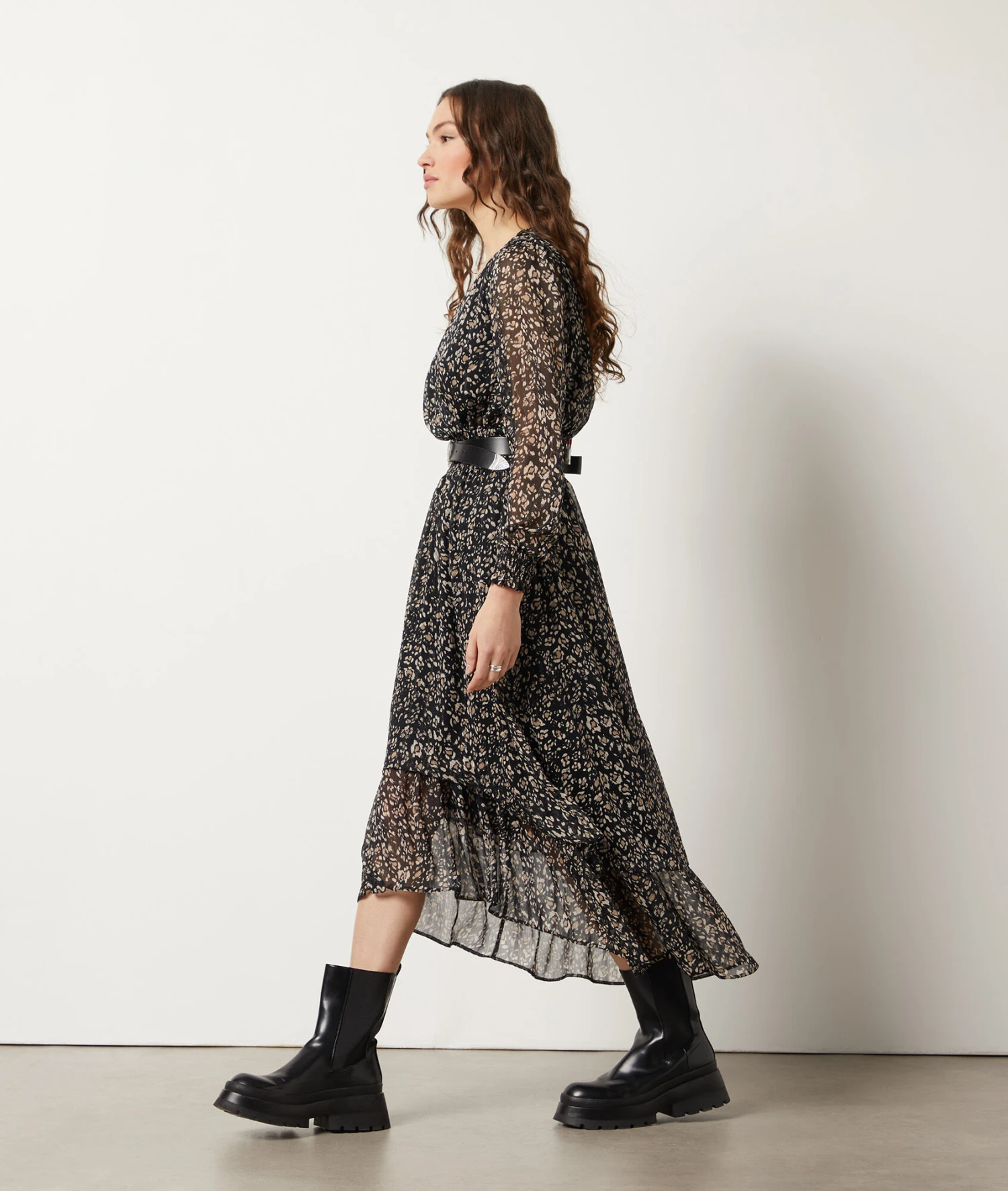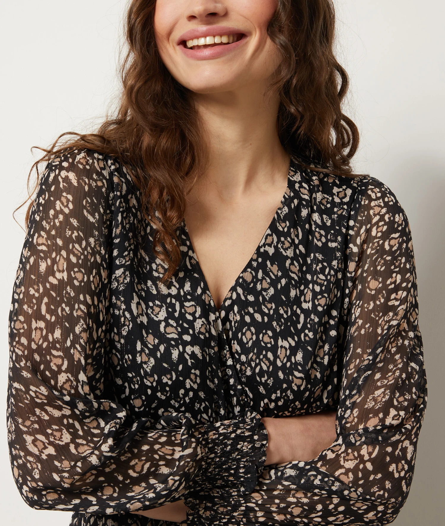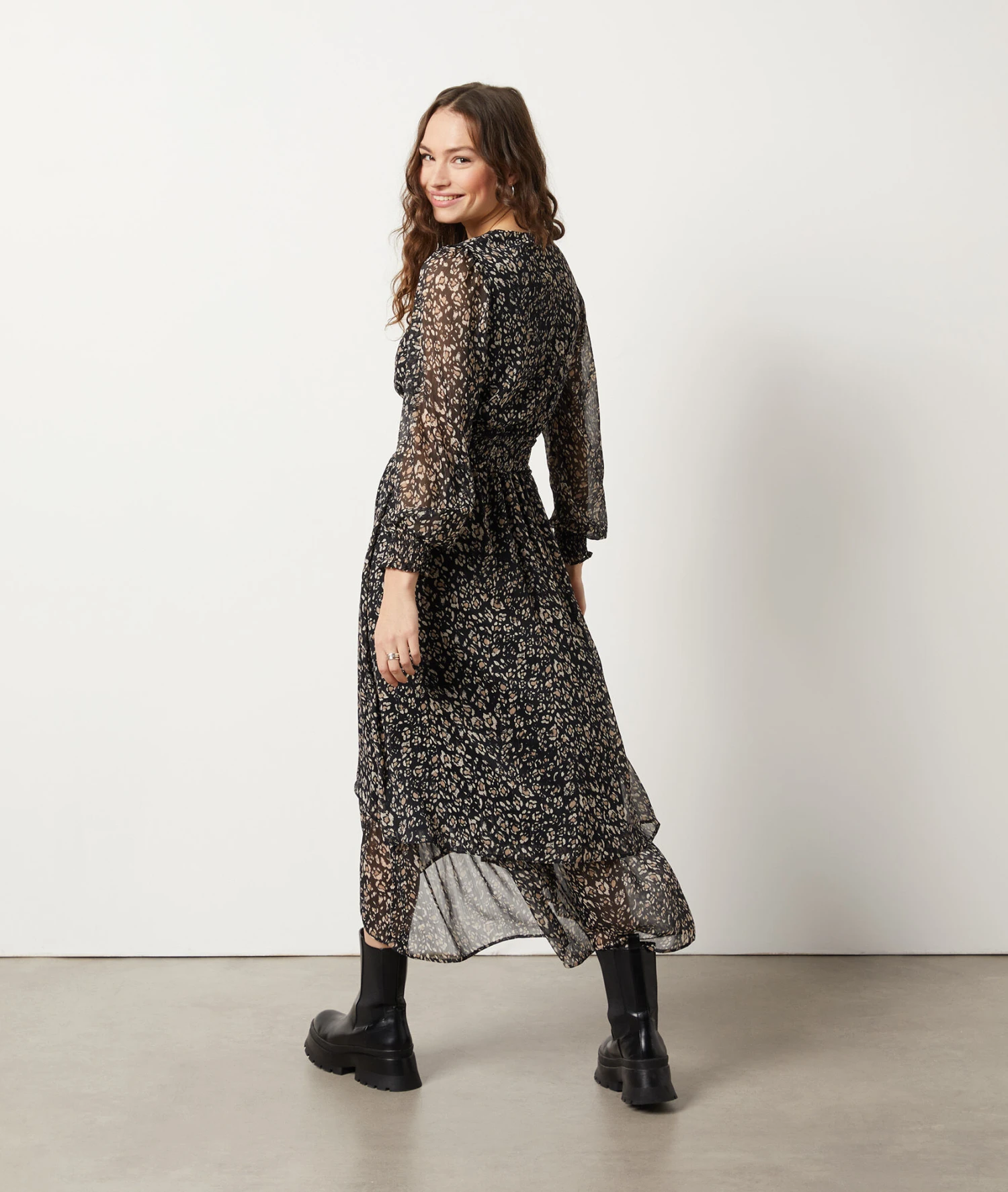 Pour un outfit de mi-saison tendance, optez pour cette robe à col V et manches longues, délicatement smockée à la taille. Fluide et légère, elle dévoile un imprimé léopard et un volant asymétrique sur le bas.