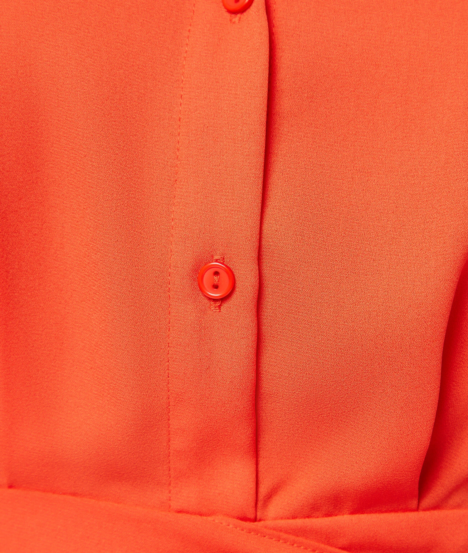 La parfaite petite robe orange, à porter en toutes occasions ! Munie d’un col chemise boutonné et de manches longues, elle dévoile une jupe délicatement nouée sur le côté.