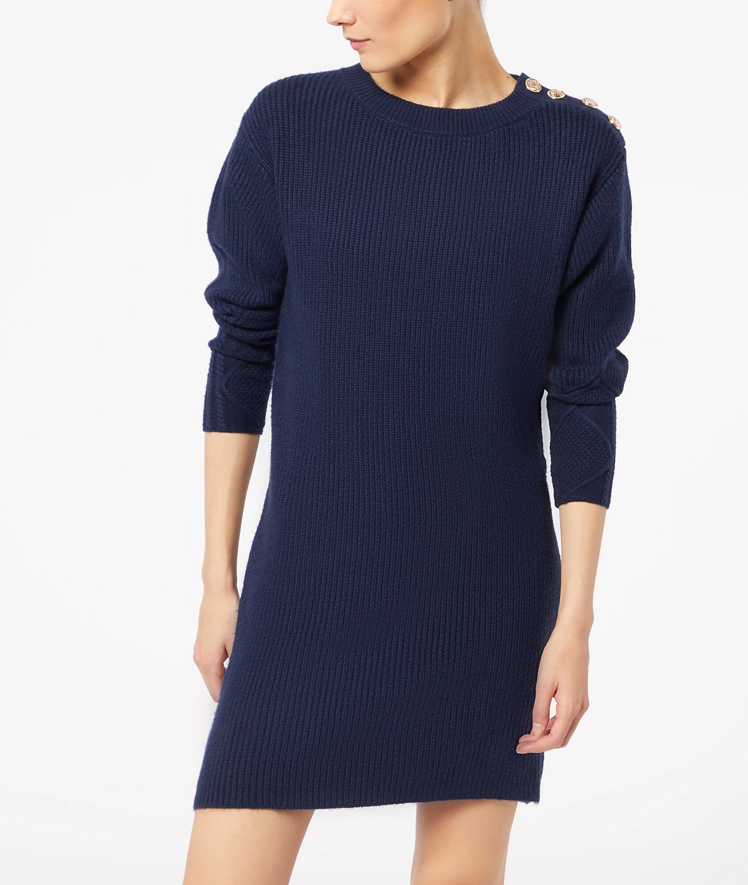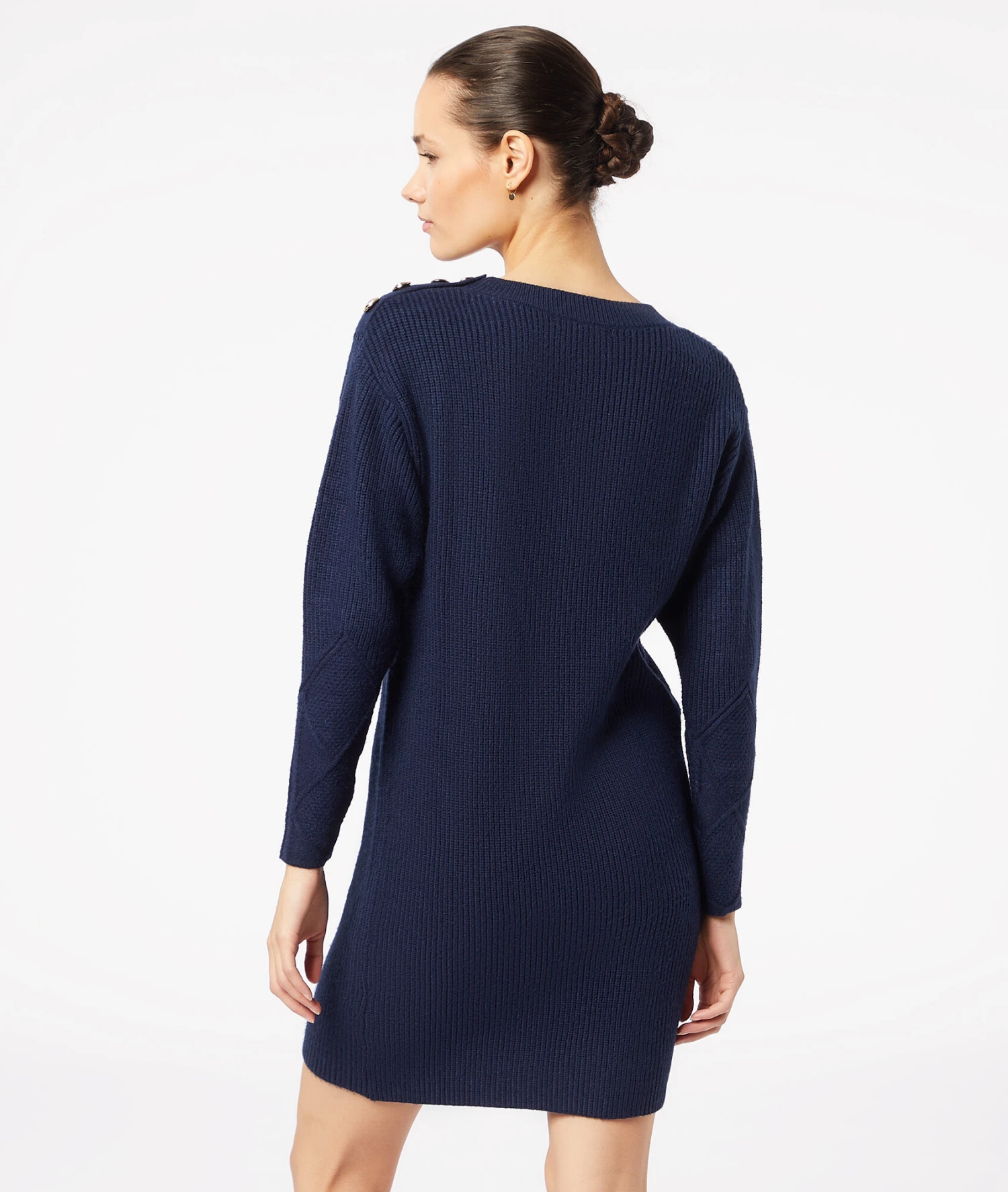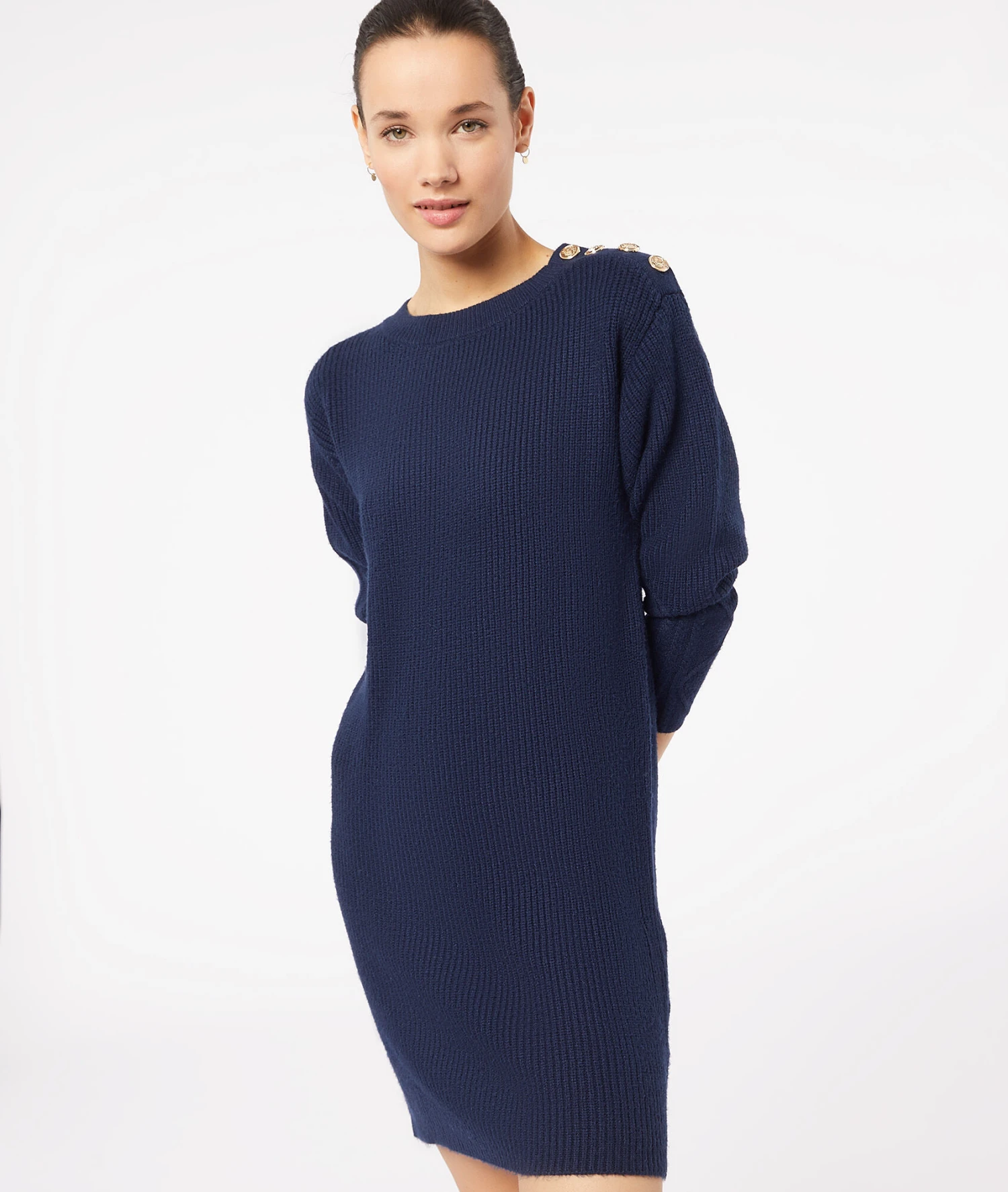 Une robe en maille à col rond et manches longues, ornée de boutons au niveau à l’épaule. A porter avec des cuissardes ou des bottines pour un look casual/chic.