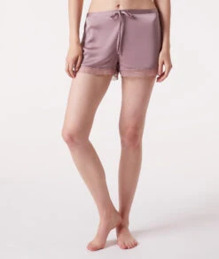 Satiné et délicatement bordé de dentelle ce short dévoile les jambes avec délicatesse et promet des nuits chics et élégantes.