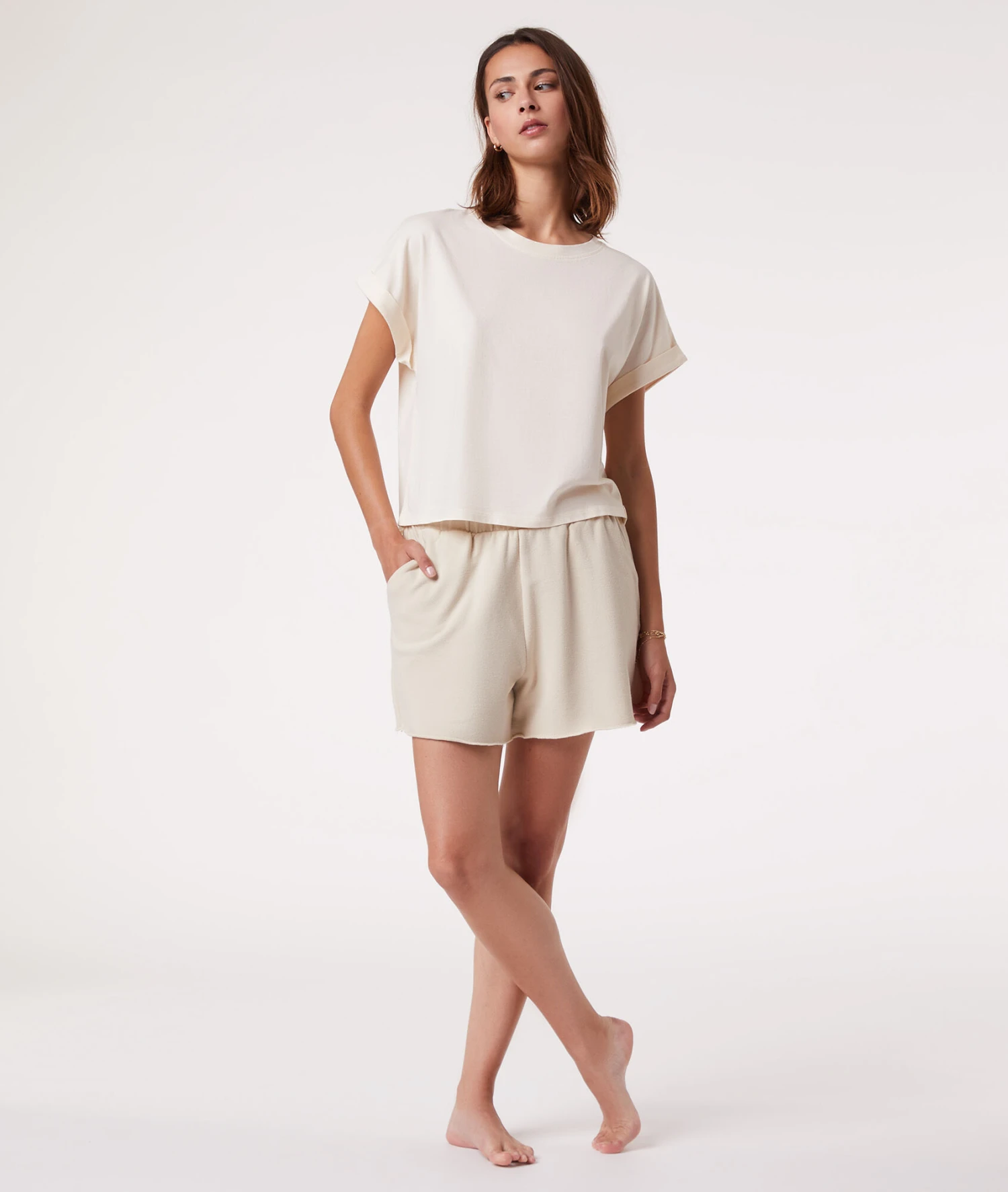 Un short uni alliant confort et légèreté, incontournable du vestiaire casual pour des nuits douces et agréables. À porter avec son haut coordonné ou à mix matcher au top de son choix.