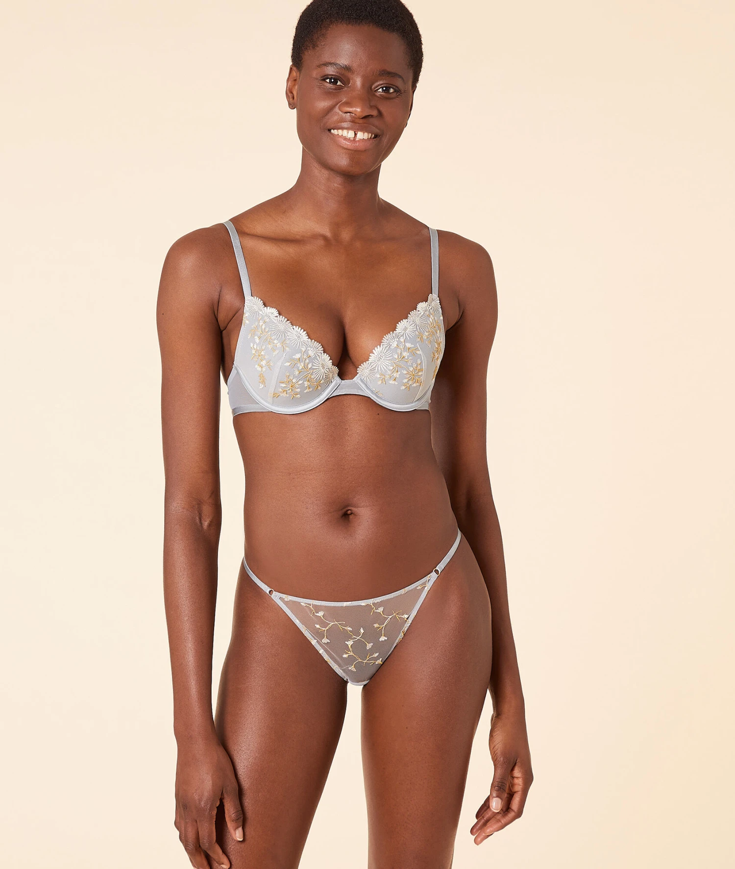 Précieux et sensuel, ce string muni d’un tulle orné de broderies françaises incarne la légèreté et la féminité tout en dévoilant avec délicatesse la peau.