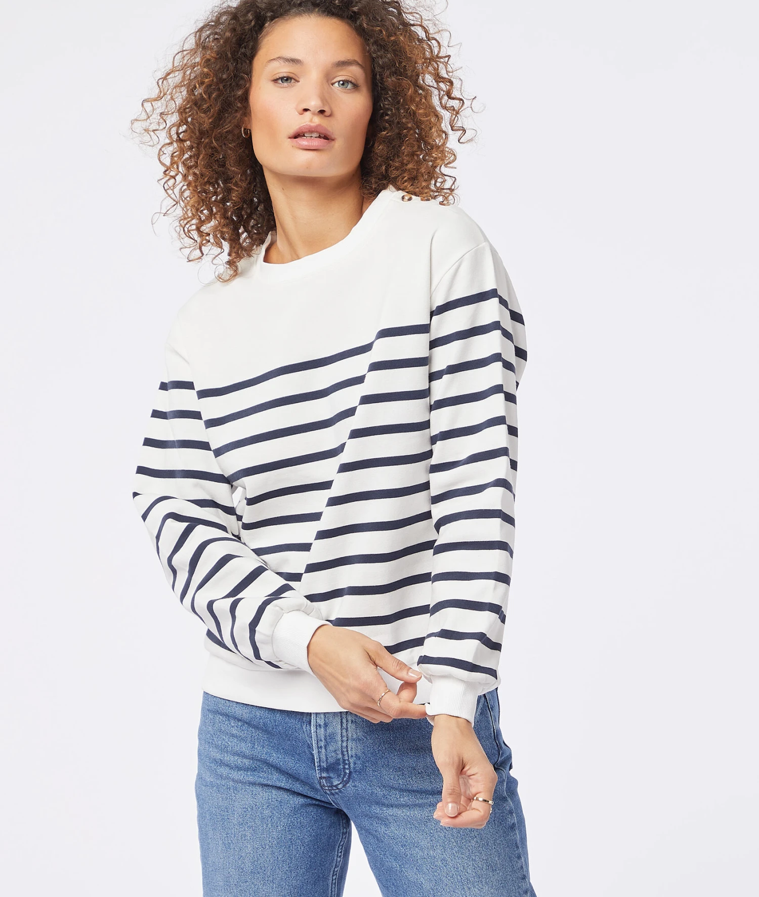 Une pièce casual à avoir absolument dans son vestiaire : la marinière revient cette saison dans une version casual, munie d’un col rond, de manches longues et de boutons contrastés à l’épaule.