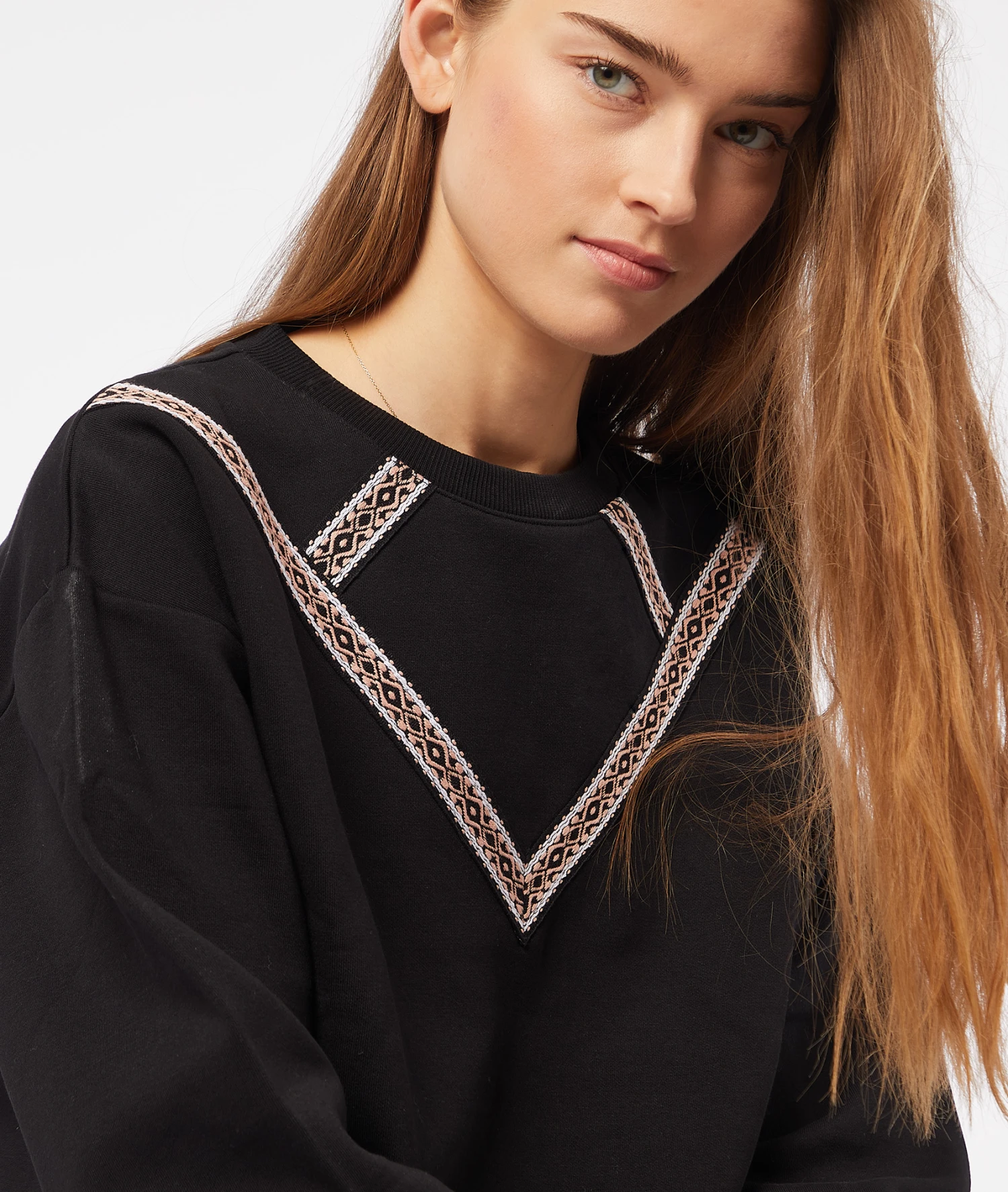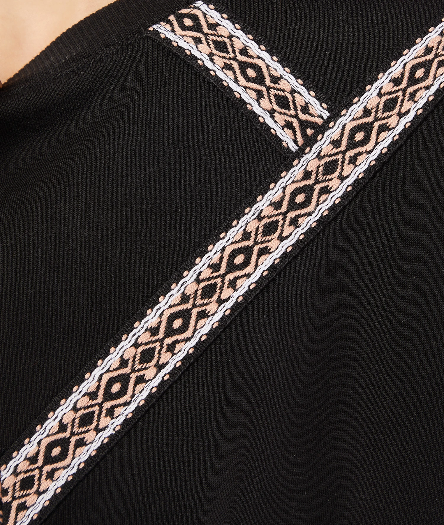 Muni d’un col rond et de manches longues, ce sweat texturé et resseré à la taille dévoile des bandes à motifs brodés autour du col.