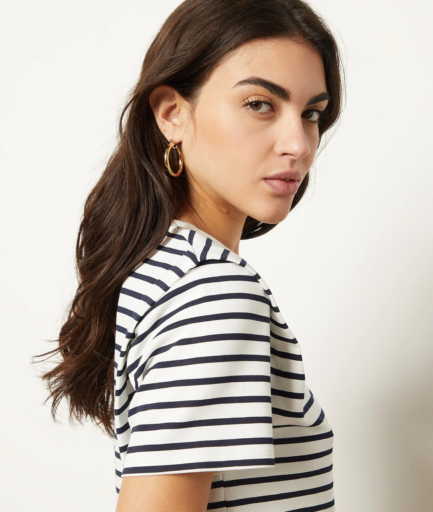 Il est l’incontournable à avoir dans sa garde-robe : le t-shirt marinière en coton à col rond et manches courtes. Il s’associe facilement avec toutes les pièces de votre armoire pour un outfit tendance.