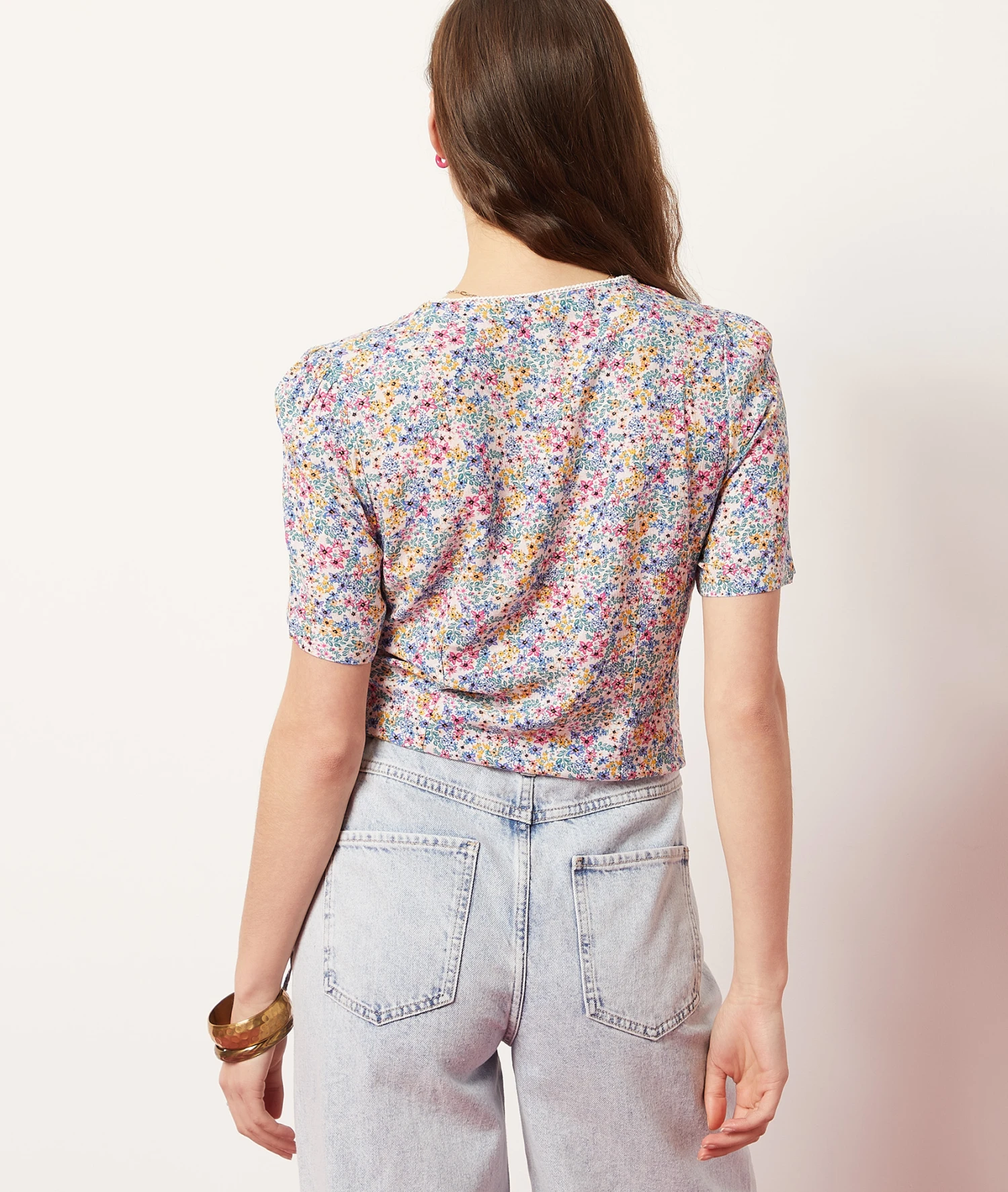 Craquez pour la forme cache-cœur ultra féminine et le motif fleuri estival dessiné sur ce top sublime. Muni d’un col V et de manches courtes, il s’associe à un jean pour un look de mi-saison tout en douceur.