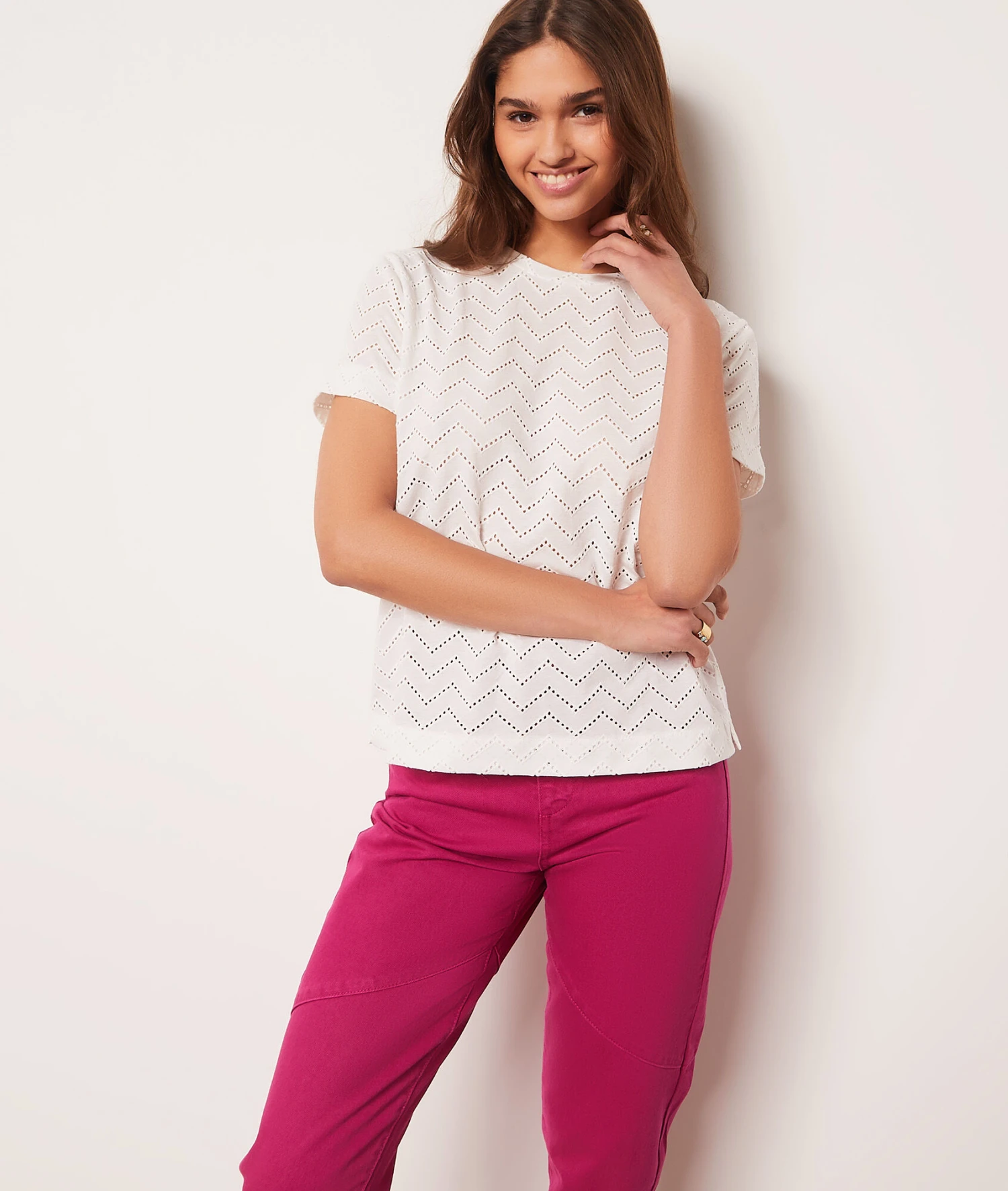 Motif coup de cœur. Ce t-shirt en coton va devenir un essentiel de votre garde-robe. Laissez-vous séduire par ce top à col rond et manches courtes ajouré, pour un style mode et tendance.
