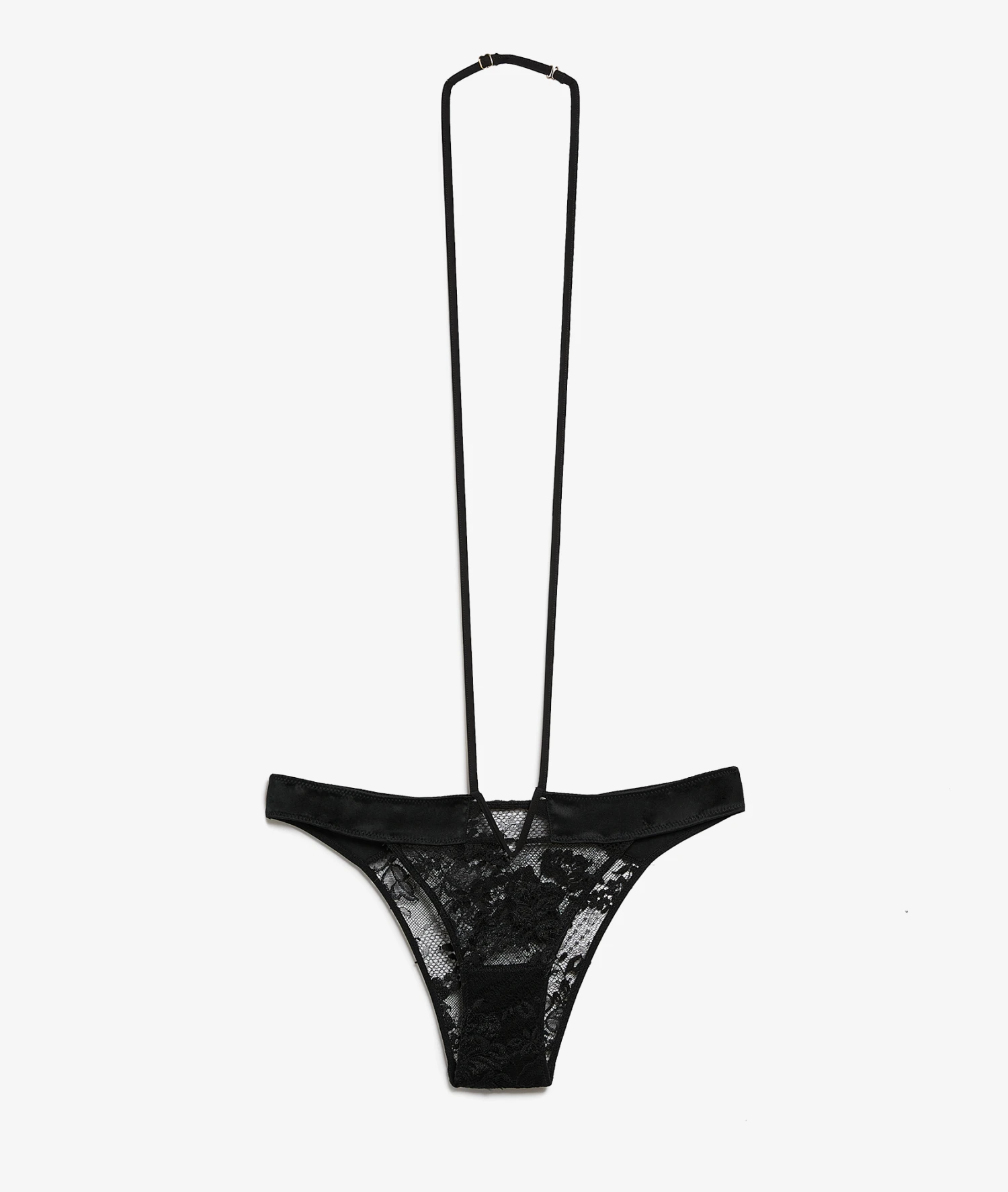 Des liens sensuels entourent le cou et une dentelle française d’exception signée Noyon, dévoilant la peau : ce tanga sexy est une pièce de lingerie couture et sophistiquée à adopter avec le soutien-gorge coordonné.