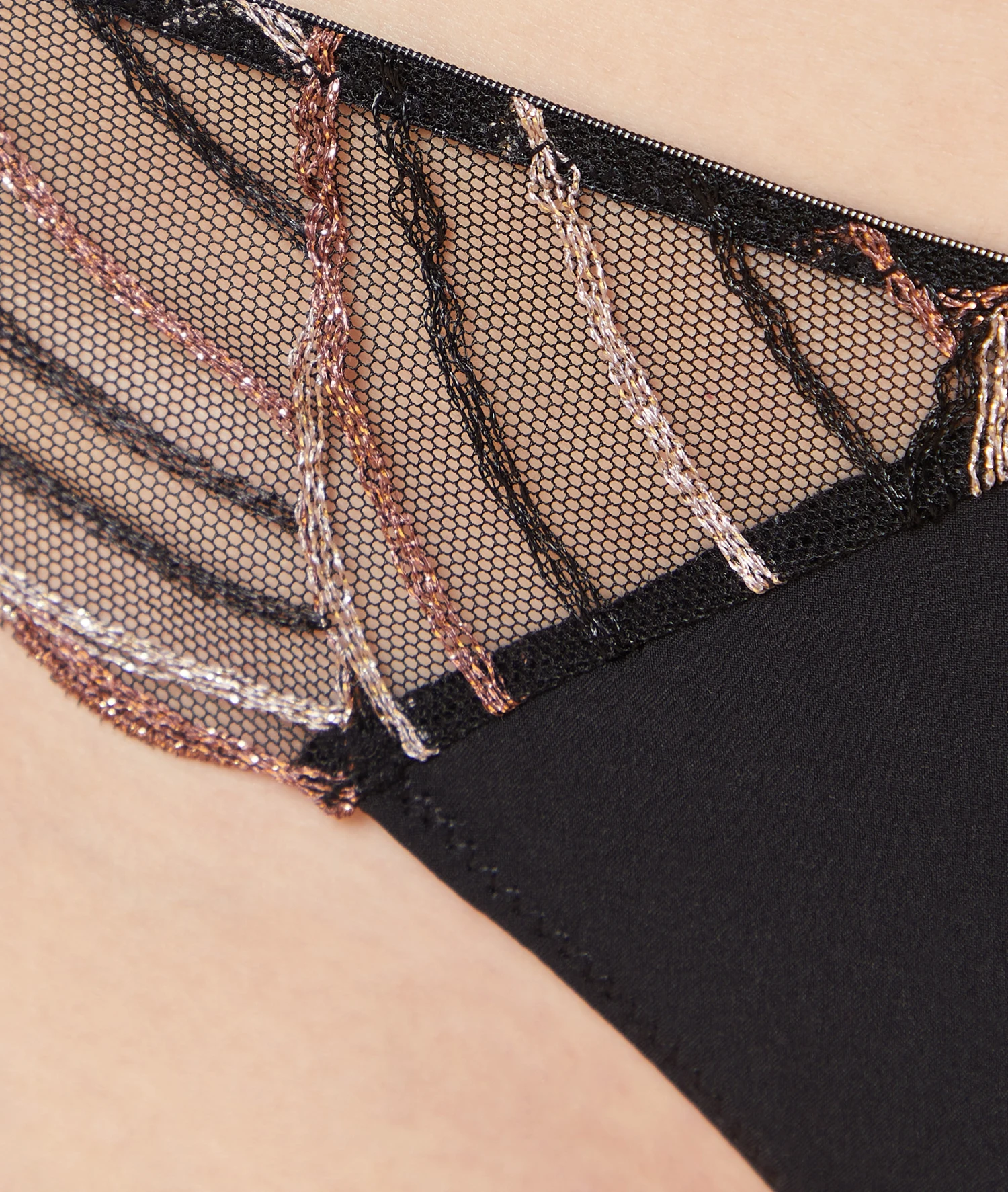 Délicatement brodé de pétales scintillants, ce tanga en tulle dévoile la peau en transparence.