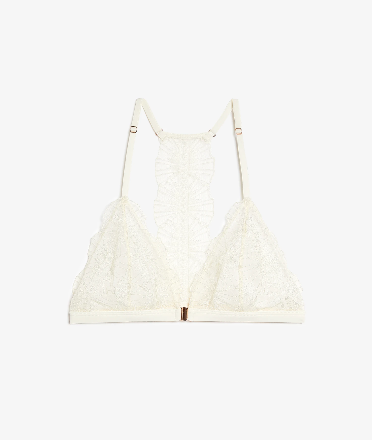 Décolleté léger et dos travaillé : ce soutien-gorge aux multiples détails minutieux et aux délicats jeux de transparence, se dévoile sous un top dos nu.