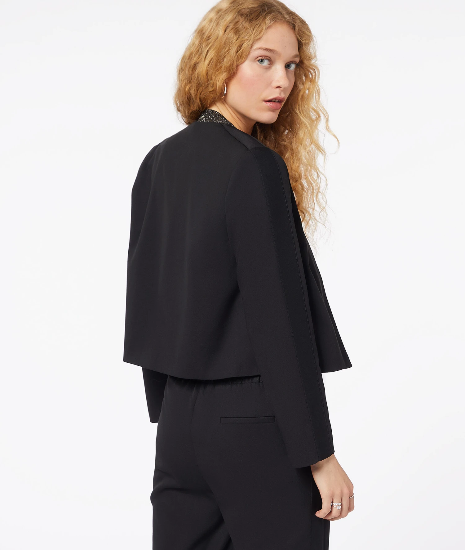 La veste noire revisitée dans une version décontractée. Une maille souple et chic, des empiècements en satin au niveau des épaules, idéale avec un pantalon de tailleur comme votre jean favori.