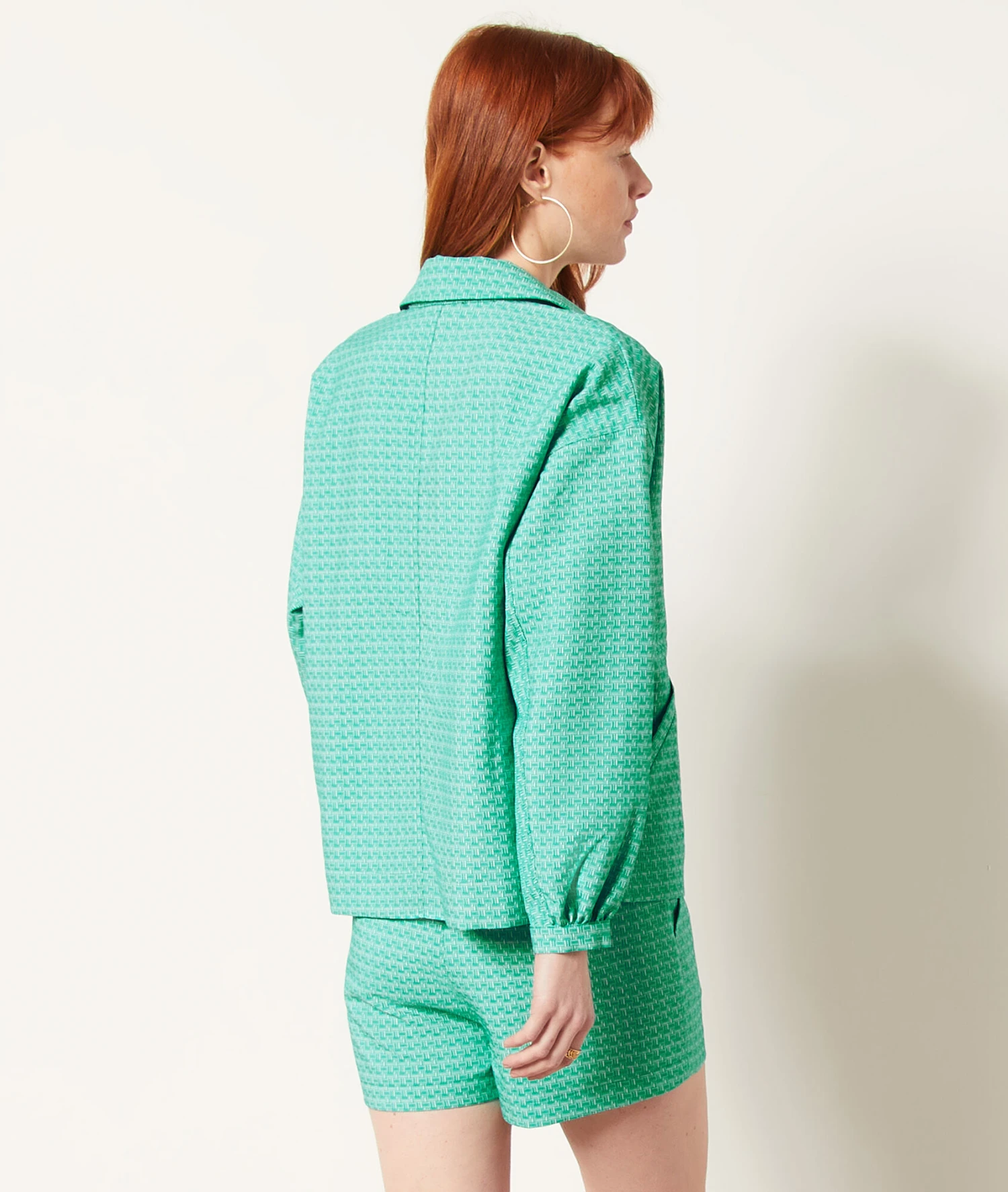 L’imprimé jacquard fait son grand retour. Cette veste à manches longues dévoile une coupe légèrement oversize et un col chemisier, à associer au pantalon coordonné pour jouer sur le total look.